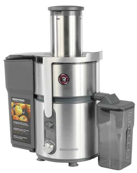 Redmond RJ-M908 входит в линейку Professional series компании Redmond. Данный прибор отличается большим диаметром загрузочного отверстия, а следовательно — у пользователя не уйдет много времени на подготовку (нарезку) исходного сырья. Некоторые овощи и фрукты влезут и вовсе без нарезки. У данной модели предусмотрено пять скоростей для получения сока из разных продуктов — от мягких ягод и цитрусовых до корнеплодов.