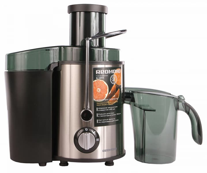 Еще одна модель Redmond — RJ-M911 — порадовала нас большим загрузочным отверстием (целых 65 миллиметров!) и большой длительностью непрерывной работы: при обработке жестких продуктов соковыжималка может работать до 30 минут без остановки, а с учетом небольших 3-минутных перерывов время работы увеличится до 1,5 часов!