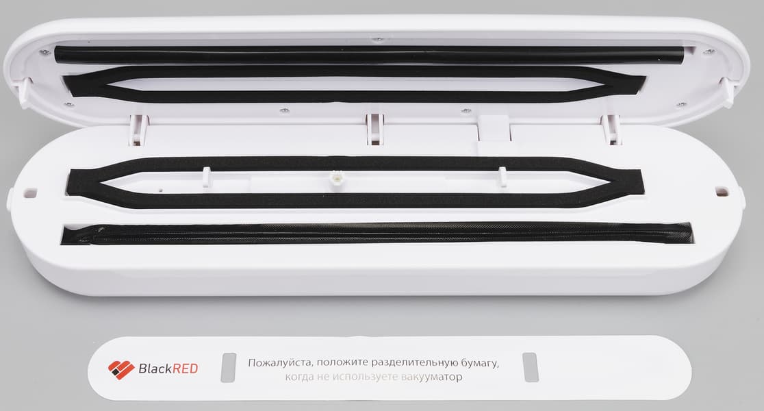 После открытия крышки перед нами предстали следующие элементы: термолента с тефлоновым покрытием для запайки, вакуумная камера и фиксаторы крышки. Производитель дополнительно советует размещать разделительную бумагу под крышку при хранении вакууматора.
