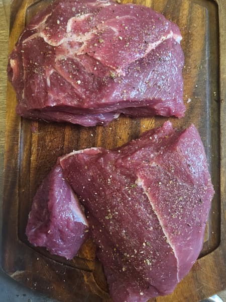Мы попробовали использовать вакууматор для продуктов, подразумевающих более интенсивное воздействие, чем лежание в холодильнике. Взяли кусок говядины. При внимательном рассмотрении поняли, что в пакет он не влезет (прилагающиеся к прибору пакеты — маленькие), поэтому разрезали мясо пополам. Посолили, поперчили.