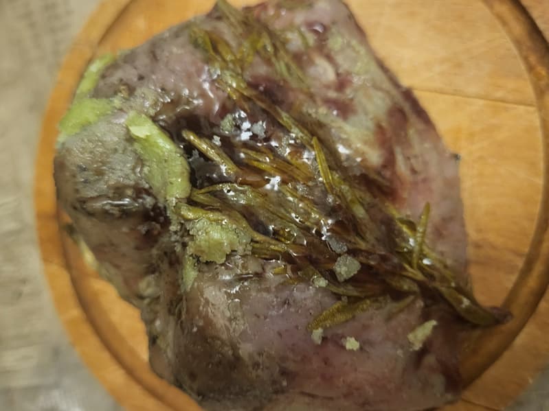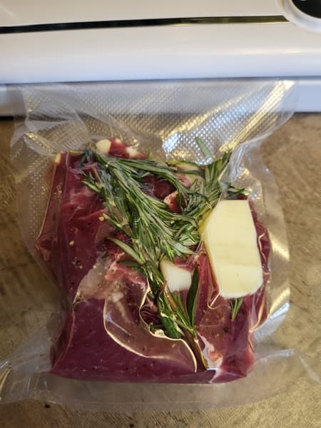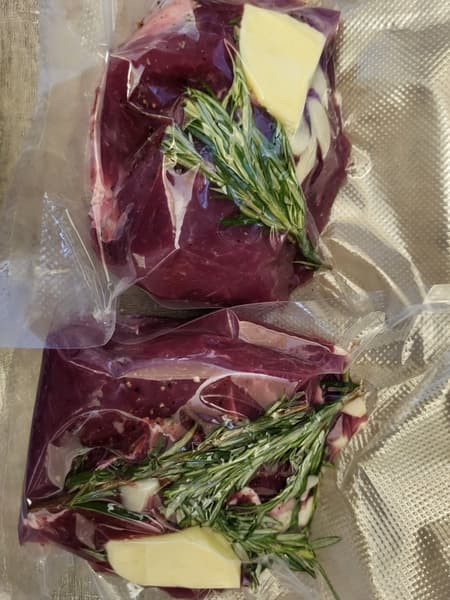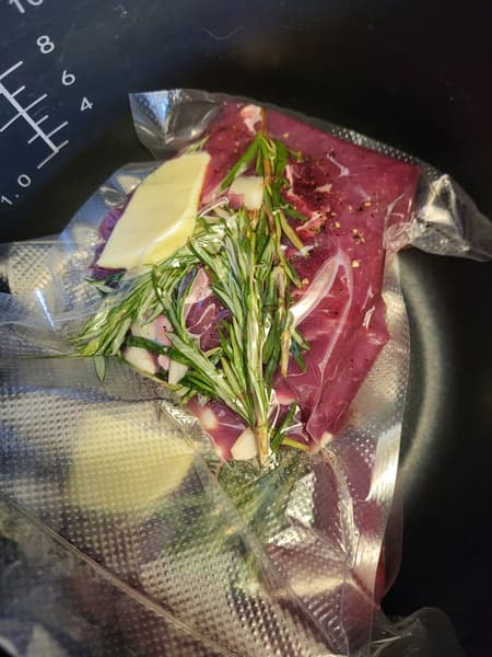 Добавили розмарин, чеснок и сливочное масло и отправили в вакууматор.