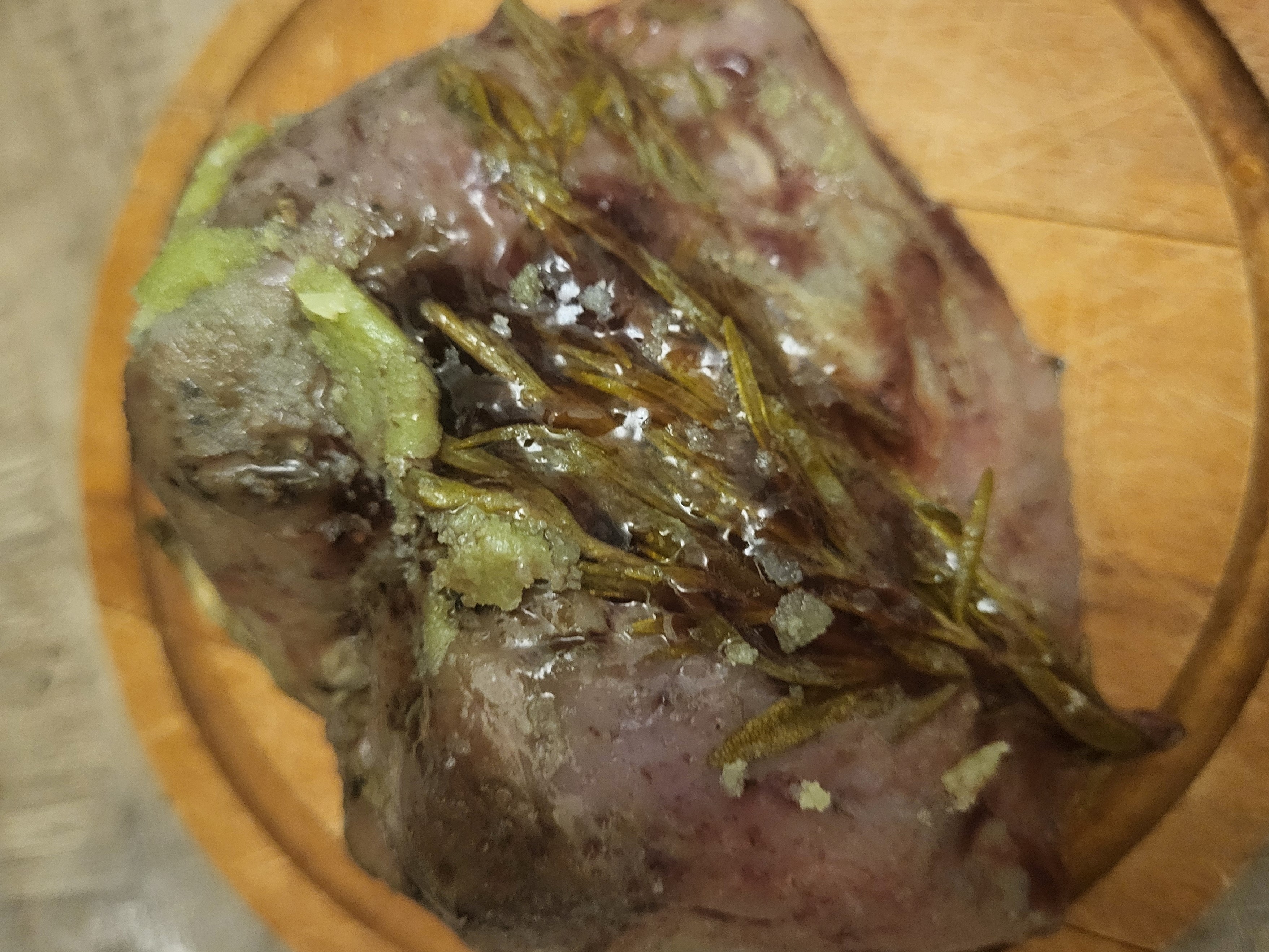 На фото — кусок говядины, вытащенный из пакета. Мы не успели сфотографировать мясо в пакете, поскольку сразу отправили его в холодильник, поэтому на фото видно немного застывшего жира и розмарин: