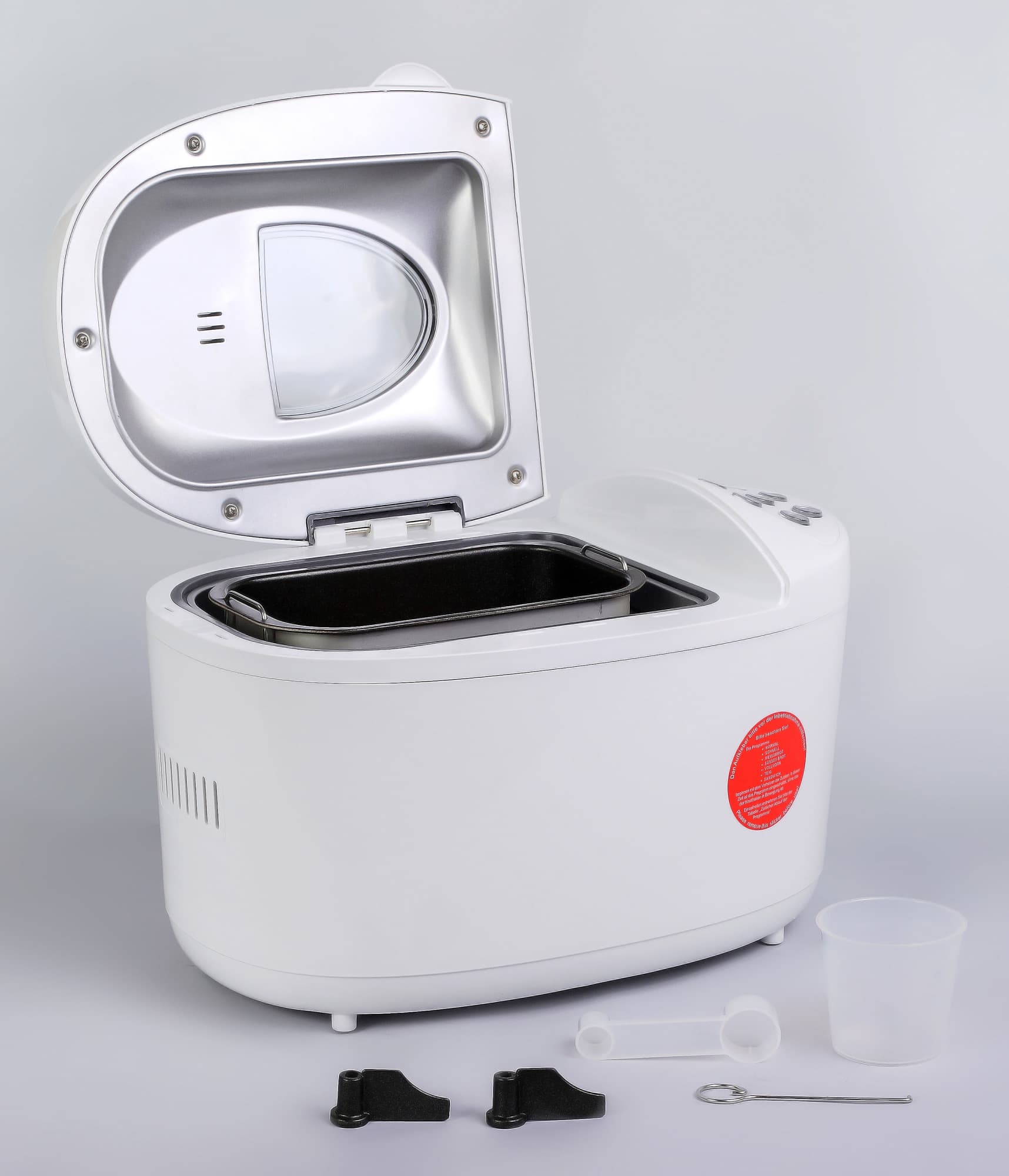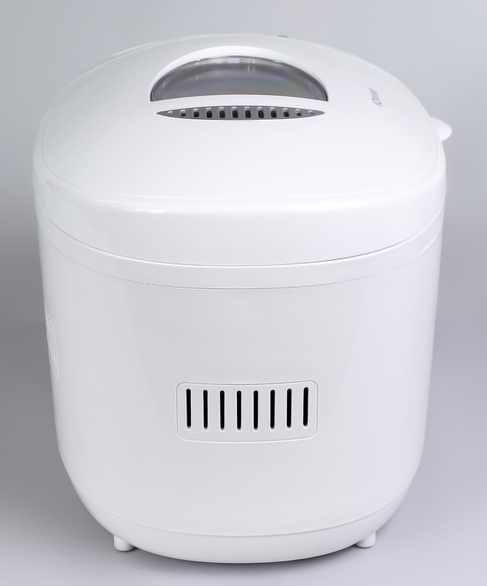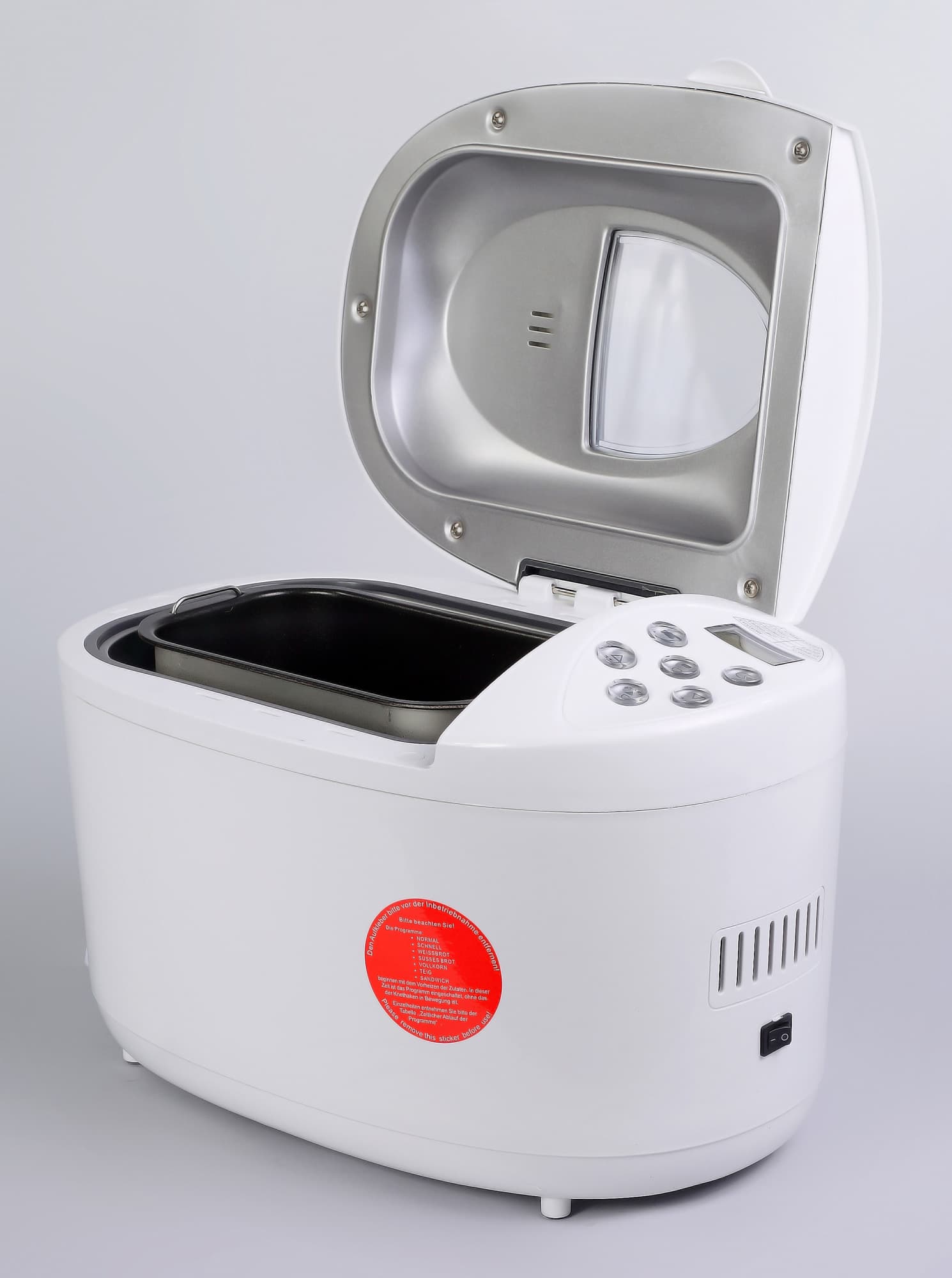 Хлебопечь крупная, при взгляде сверху имеет форму овала и за счет скругленных линий не давит своей монументальностью. Белый пластик, прозрачное смотровое окошко и выпуклые кнопки под крохотным дисплеем выглядят скромно, просто и аккуратно. Устойчивые белые же ножки и в меру длинный шнур того же цвета дополняют «легкий» вид прибора. На корпусе присутствует наклейка с немецким текстом и просьбой отклеить ее перед началом работы, написанной отчего-то на английском.