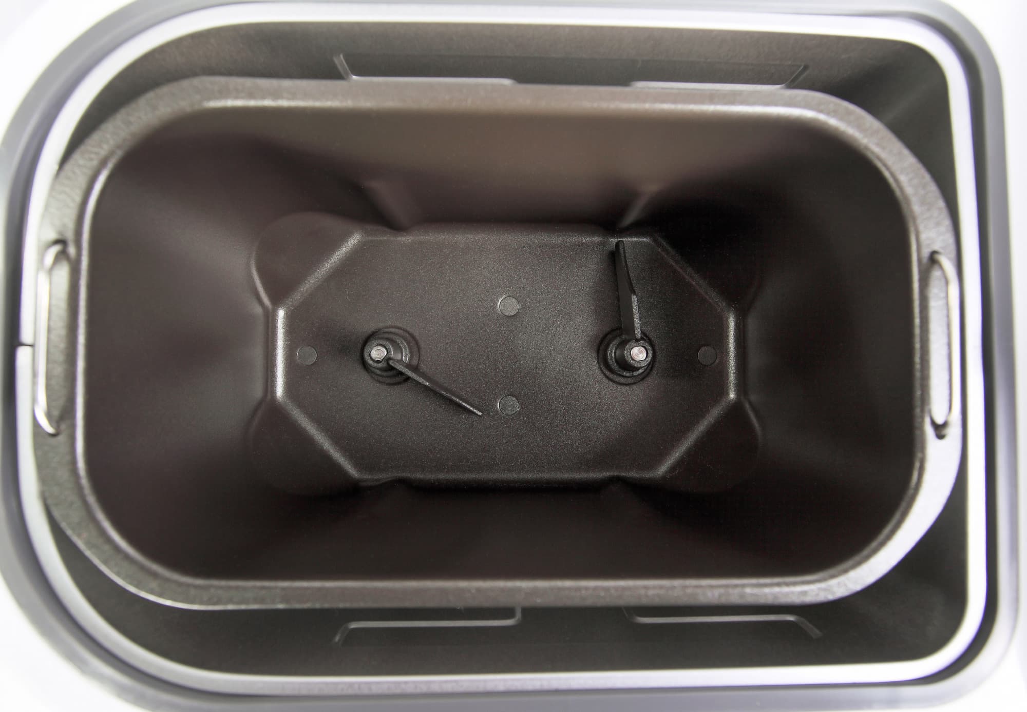 Чаша прямоугольной формы сразу привлекает внимание наличием двух лопастей для замеса теста. На нижней стороне рядом с креплениями мы обнаружили белые следы заводского клея или силикона, но они никак не среагировали на нагревание в процессе работы прибора.