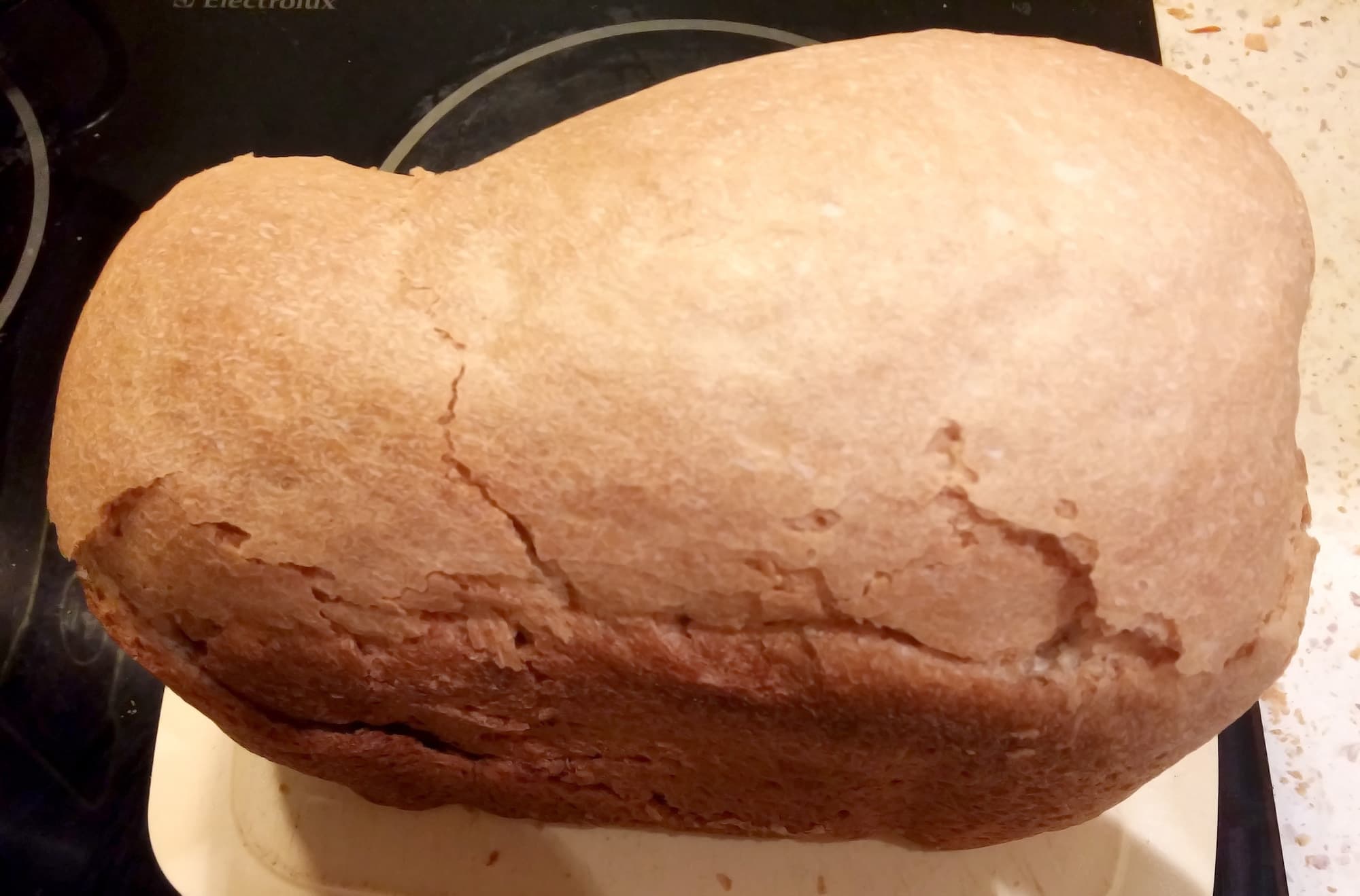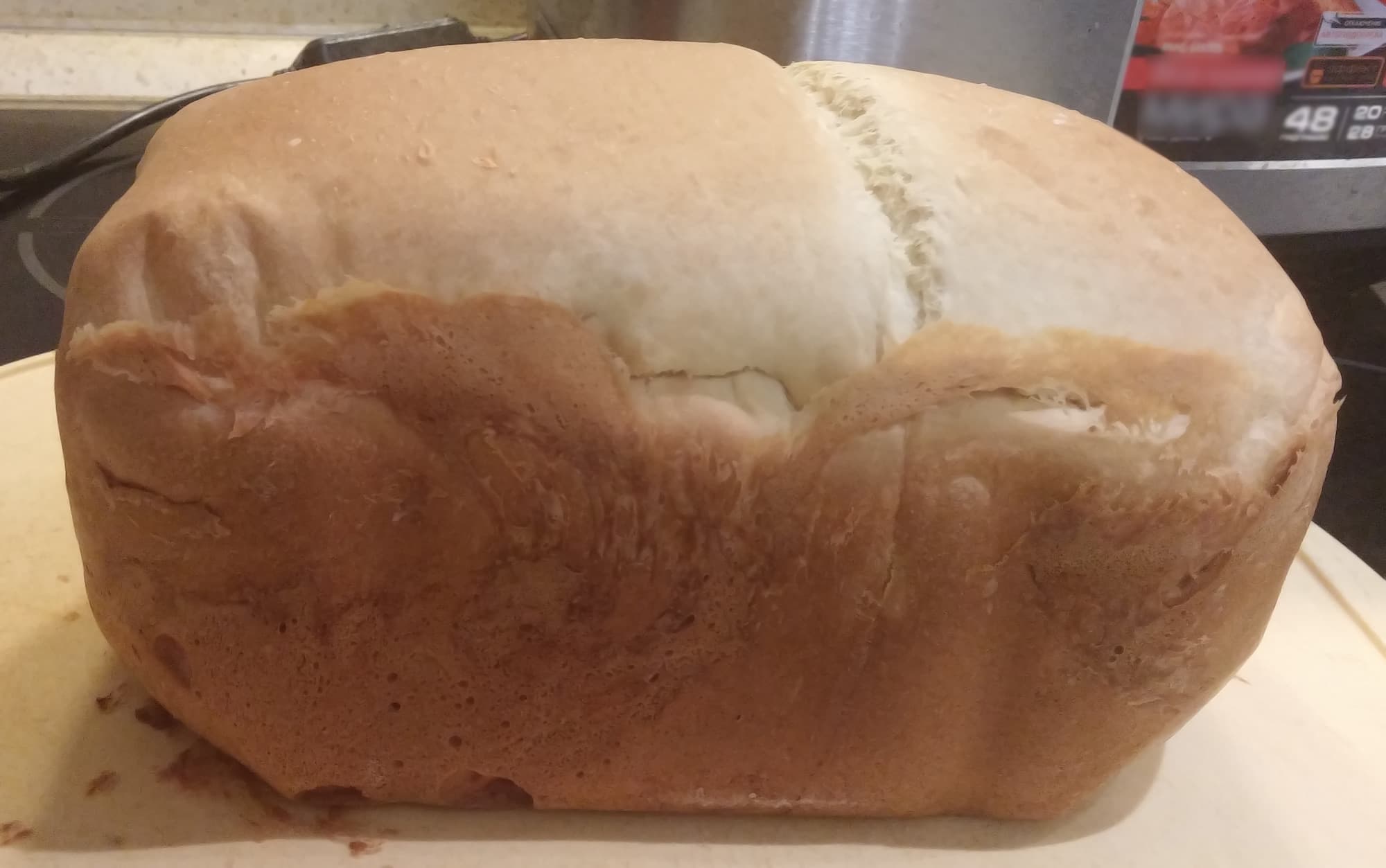Нам показалось странным, что рецепт с таким названием использует не соответствующий режим «Белый хлеб», а «Сэндвич». Однако результат нас порадовал, хлеб получился пышным, в меру румяным, хотя эстетика немного пострадала из-за трещины на верхней корочке.