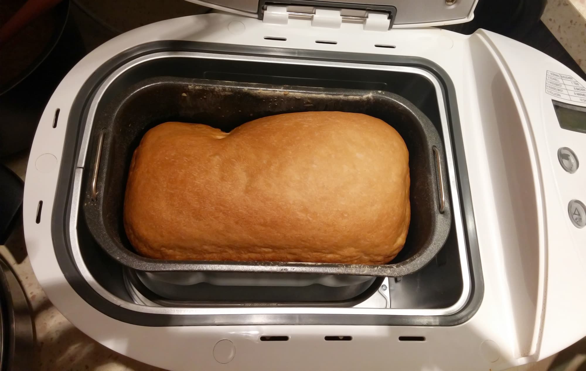 К счастью, пропорции любимого нами рецепта классического белого хлеба подошли и к данной хлебопечи, поэтому хлеб мы получили примерно такой, как ожидали, за исключением одного нюанса. Так как это был первый опыт, покрытию чаши не хватило антипригарности, в результате буханка крепко прилипла к чаше и не желала оттуда вылезать, несмотря на примененные советы из инструкции.