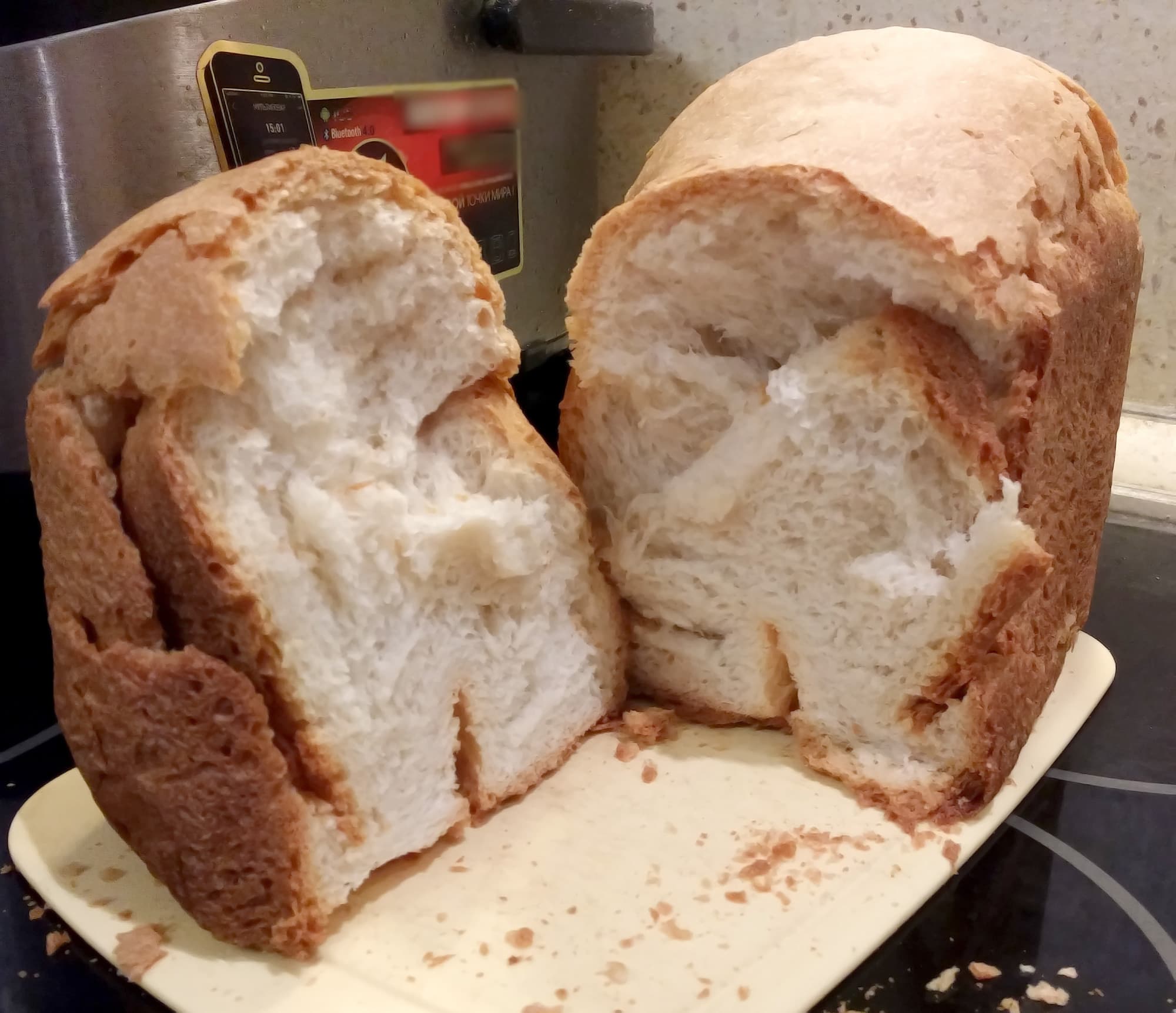 В итоге хлеб мы выковыряли, но его внешний вид, конечно, пострадал: на тонкой хрустящей корочке образовались трещины. Внутри хлеб был белый, воздушный (но не слишком), нежный (но не сырой). Режимы «Обычный» и «Белый хлеб» (в рецепте указан второй) отличаются по времени работы, однако результат оказался примерно одинаковым. Последующие эксперименты не вызывали такого сильного прилипания хлеба, поэтому снизим оценку лишь за отсутствие нужных цифр в рецепте.