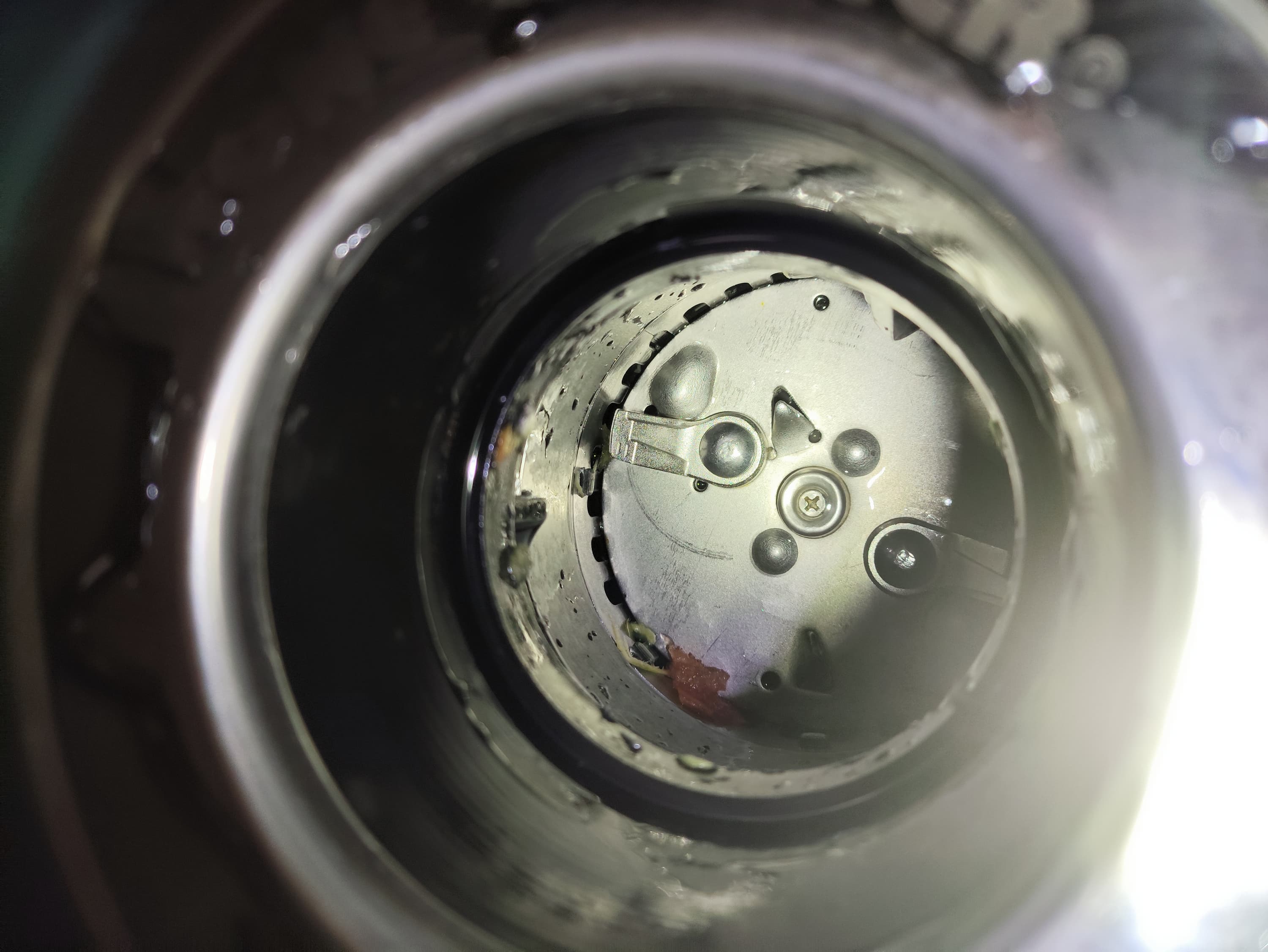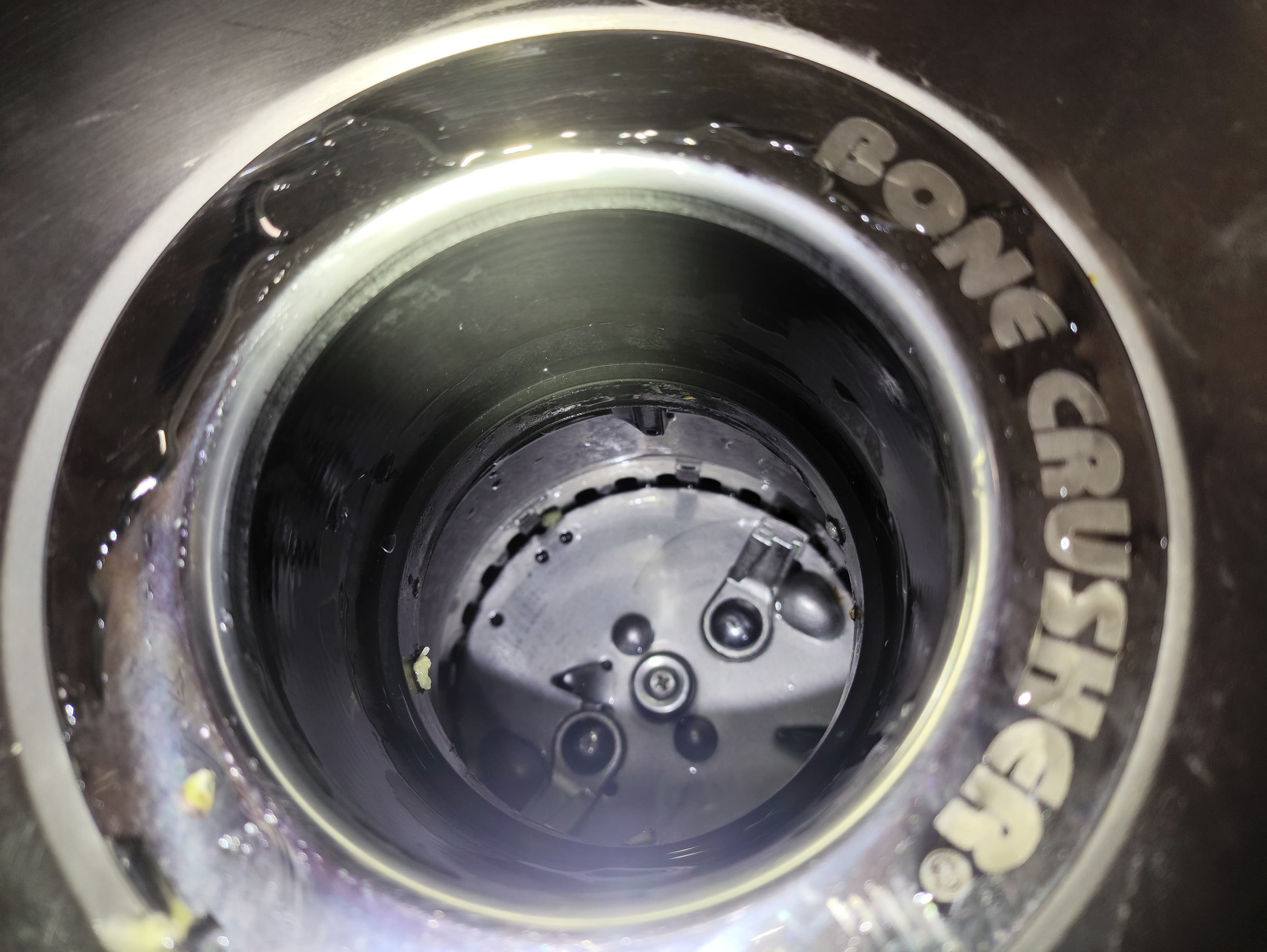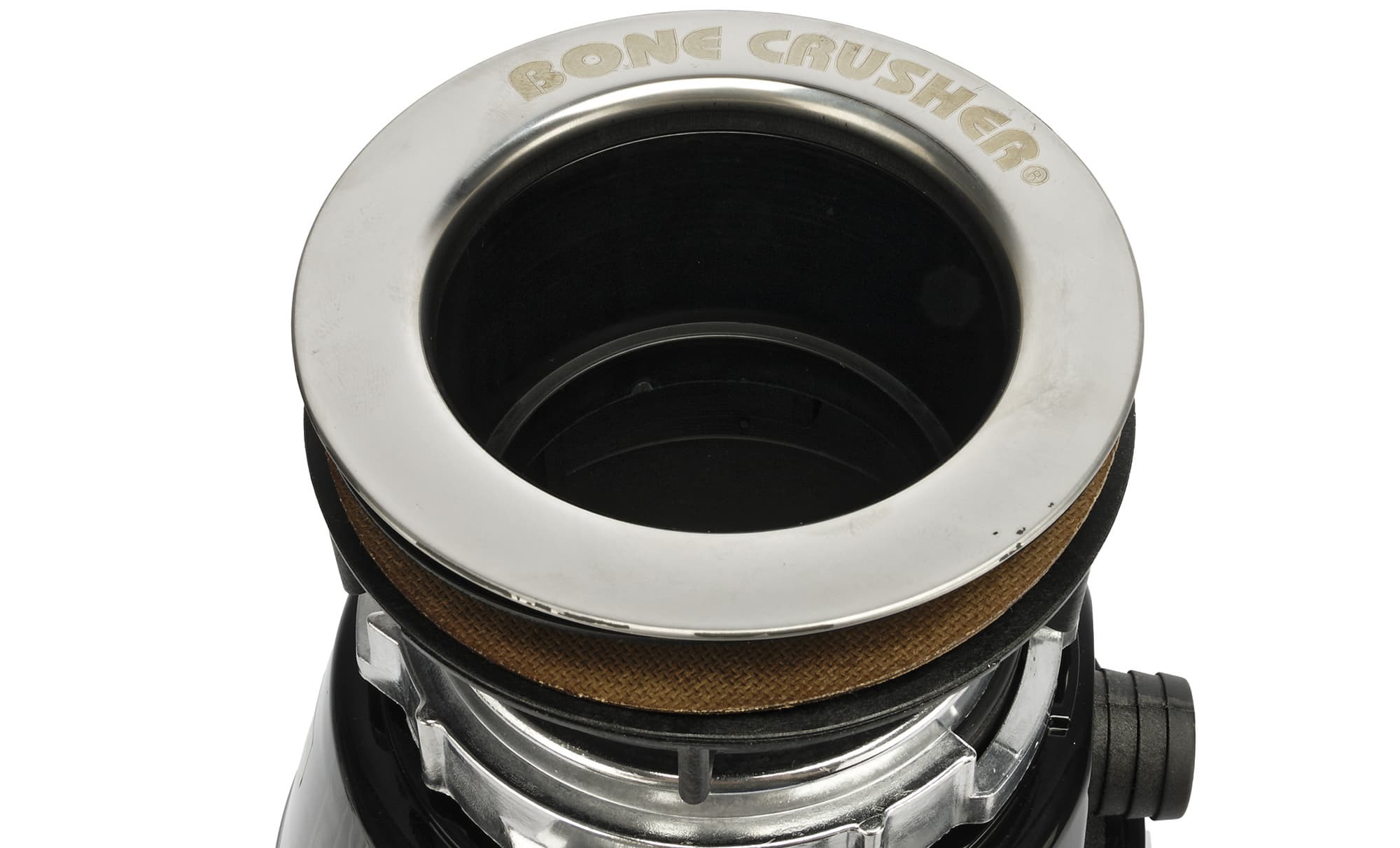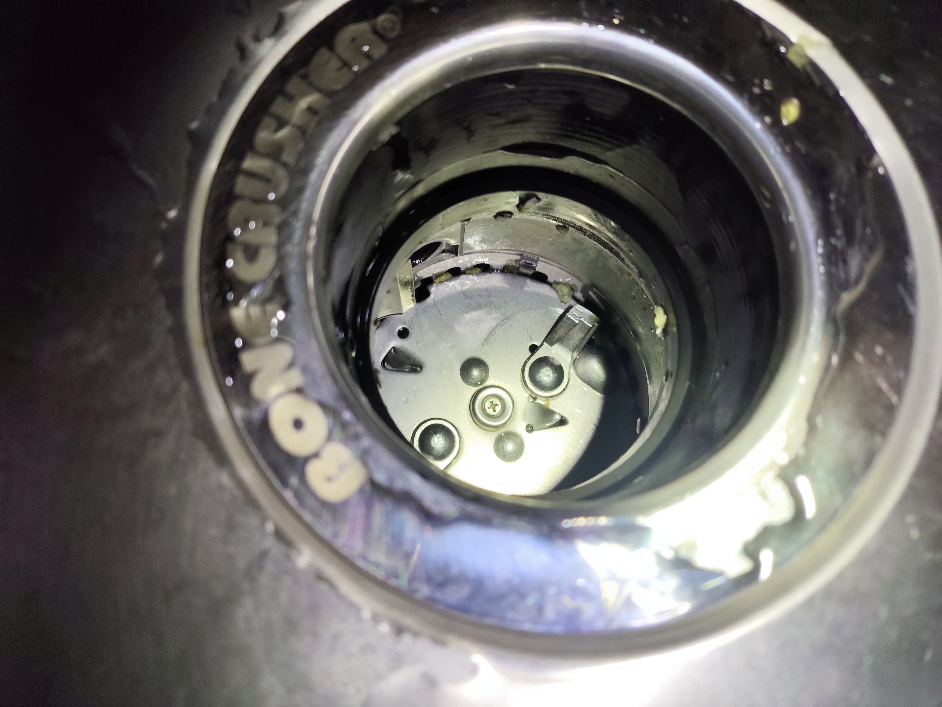 Если заглянуть внутрь измельчителя, то мы увидим внутренности рабочей камеры. На дне находятся лепестки измельчителя и два острых язычка. Именно тут отходы будут измельчаться, после чего попадут в канализацию.