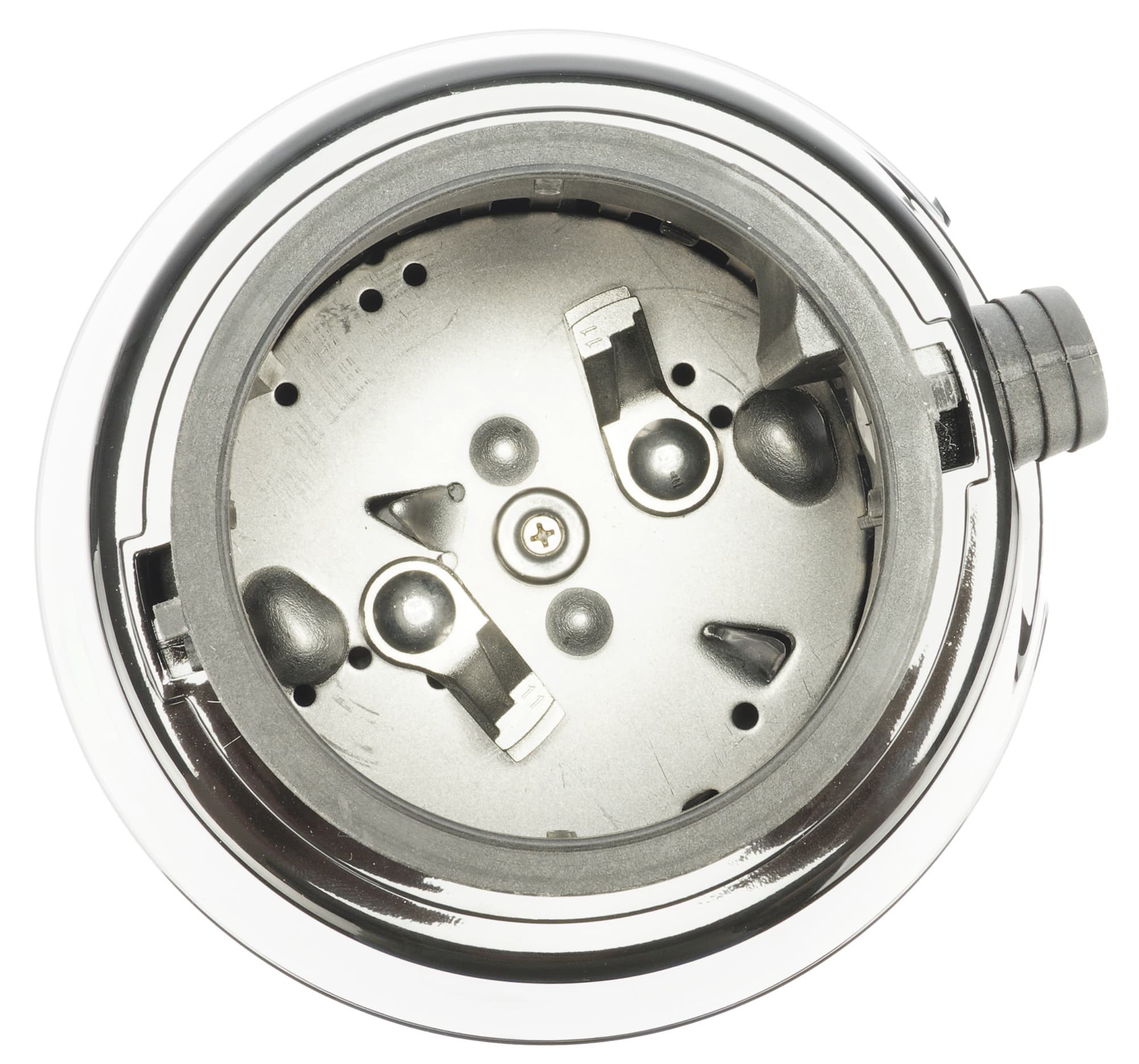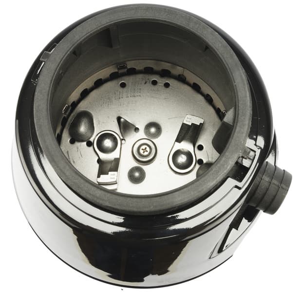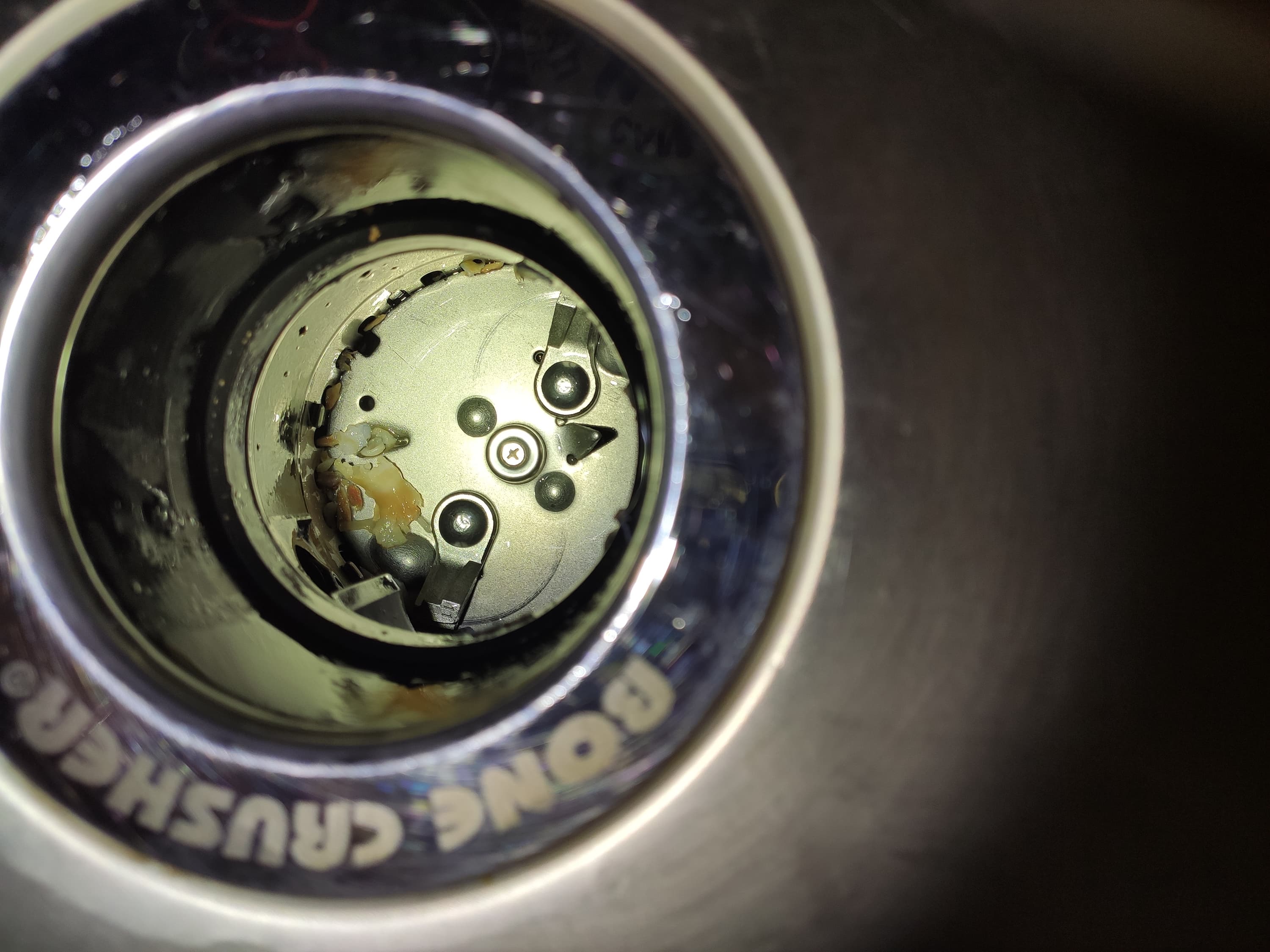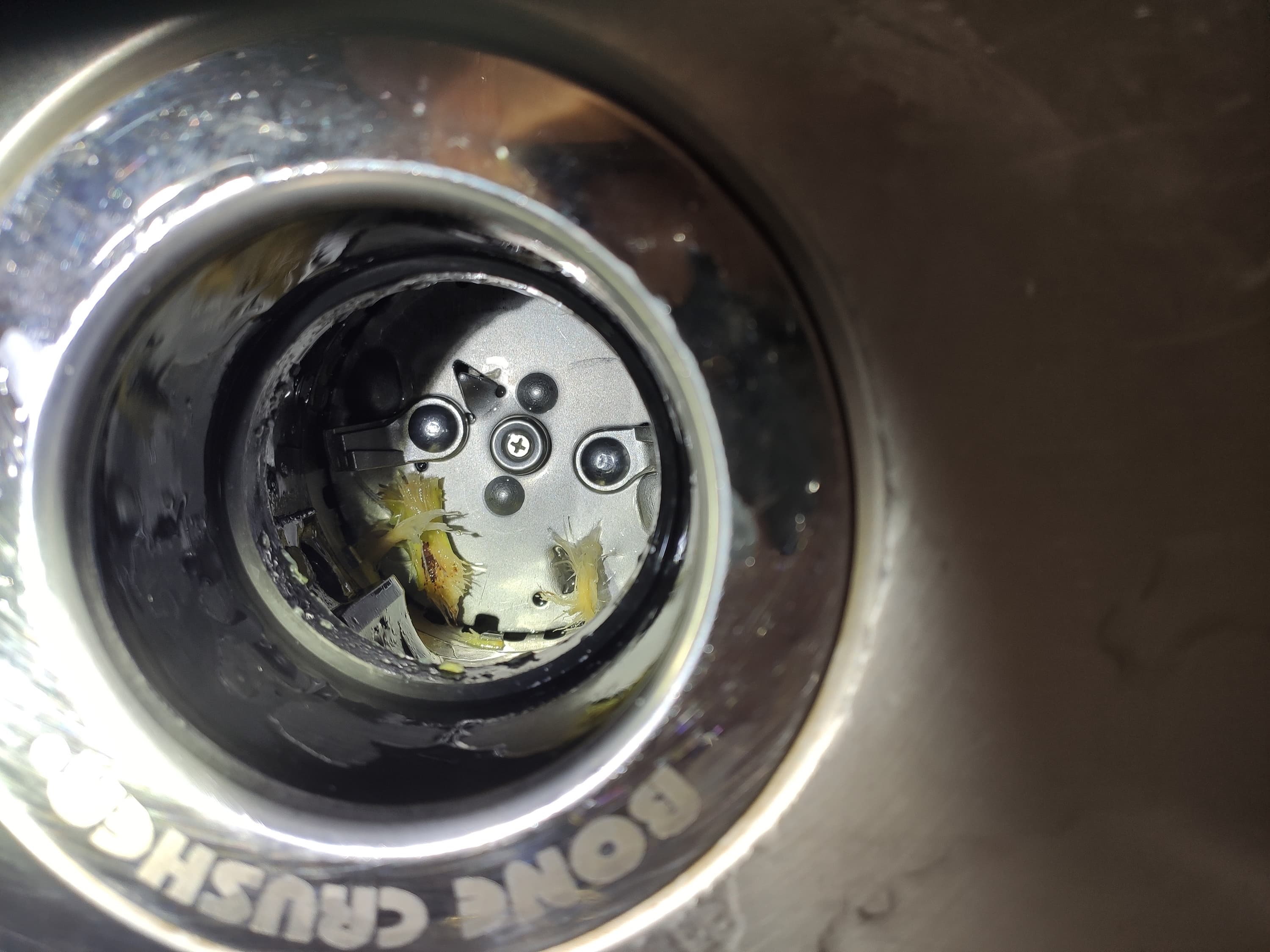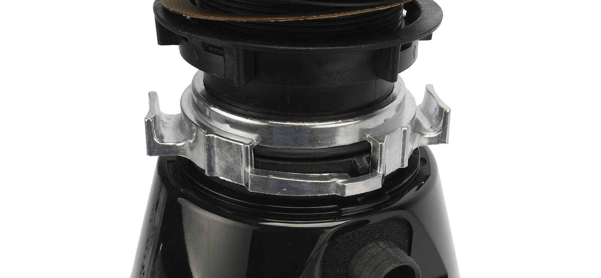 Если заглянуть внутрь измельчителя, то мы увидим внутренности рабочей камеры. На дне находятся лепестки измельчителя и два острых язычка. Именно тут отходы будут измельчаться, после чего попадут в канализацию.