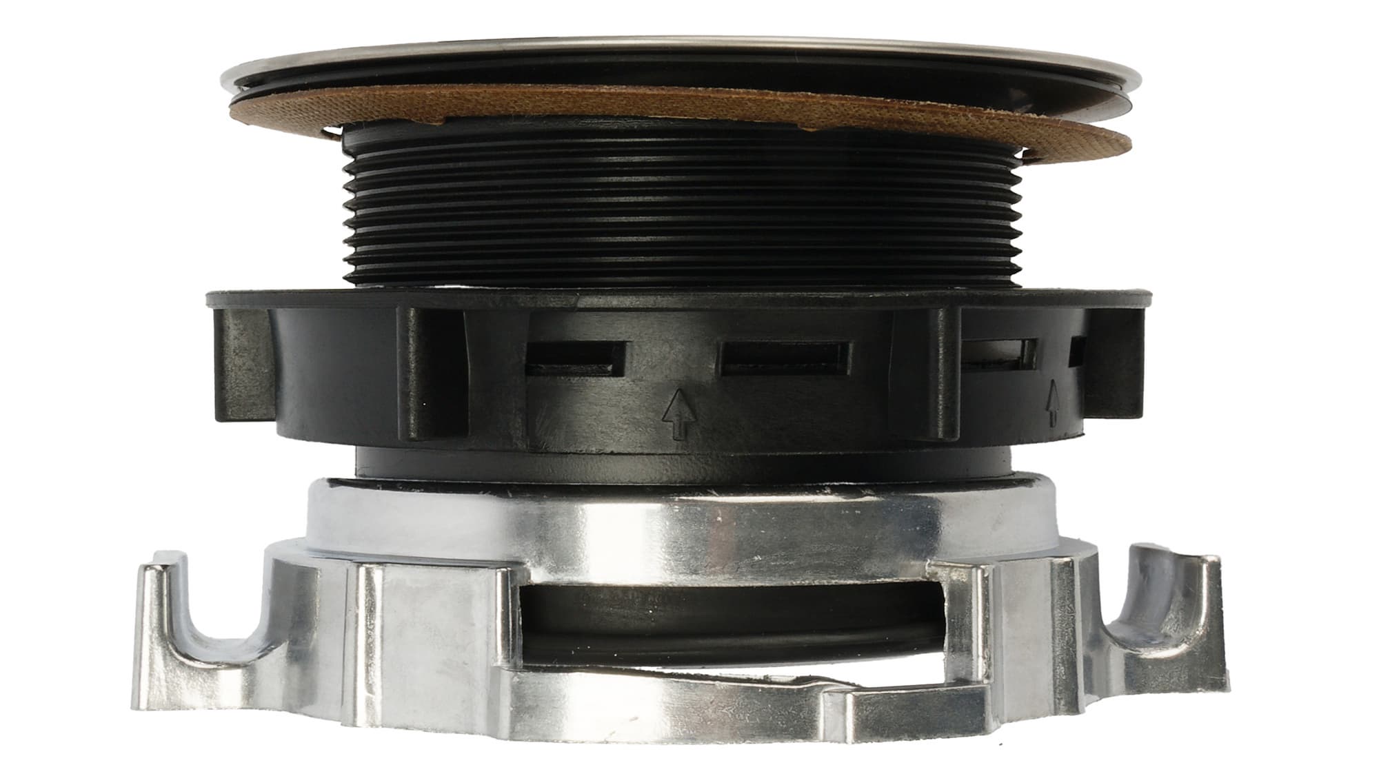 После этого затягиваем пластиковое кольцо-гайку, чтобы избежать протечек (на детали указано правильное расположение — стрелочкой вверх), а затем подвешиваем снизу прибор и фиксируем его вторым кольцом, металлическим, которое также затягиваем вручную.