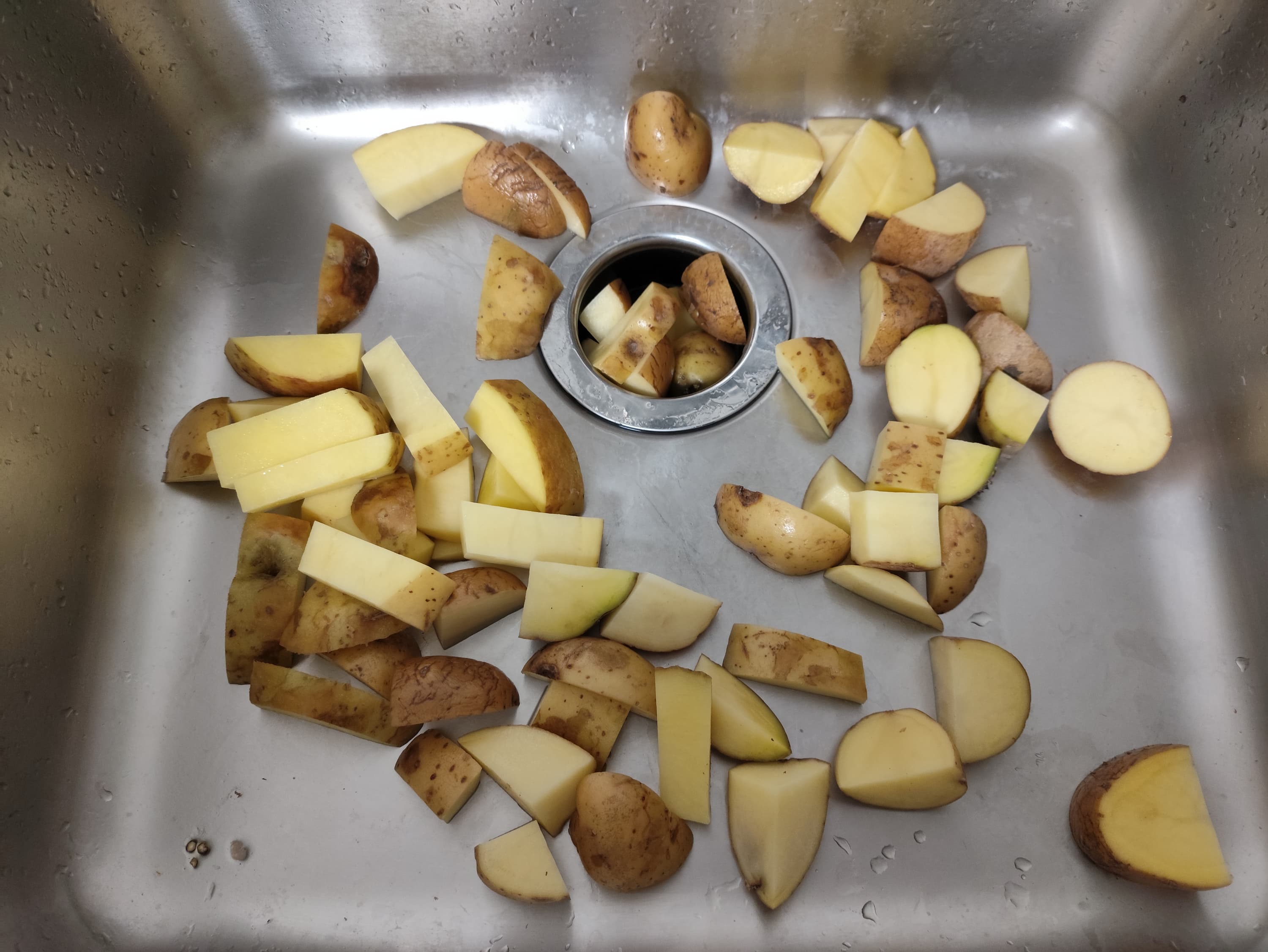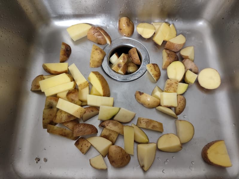 Картофель мы помещаем в измельчитель максимально быстро, однако не превышая комфортной для пользователя скорости. То есть стараемся подавать кусочки в отверстие слива без задержек, но и без лишней суеты. Примерно с той скоростью, с которой делали бы это в реальной жизни.