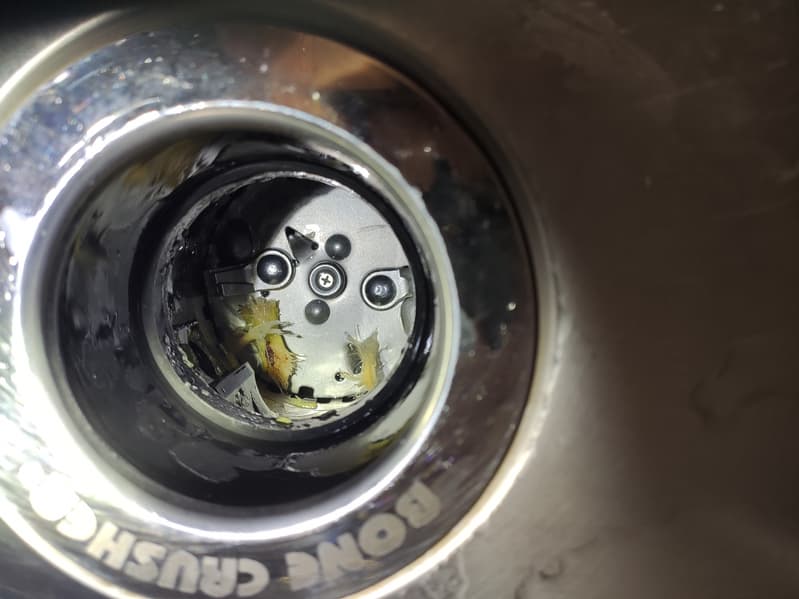 Если измельчитель заклинило в процессе работы, нужно отключить его от сети (выдернуть провод из розетки), достать защитный экран, вручную удалить посторонние предметы и остатки отходов из камеры, после чего дать двигателю отдохнуть (остыть), нажать кнопку перезапуска на боковой стороне корпуса и подключить прибор обратно к сети.