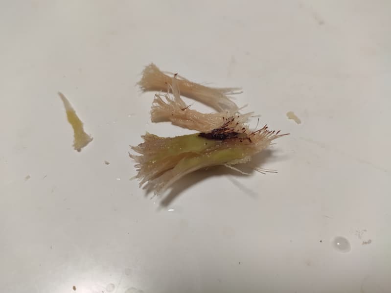Следующий тест — банановые шкурки. Это тоже довольно частый тип отходов. Наш предыдущий опыт показывает, что измельчаются они в целом хорошо, однако нередко в камере остаются волокнистые кусочки, присутствующие в основном в банановых «хвостиках».