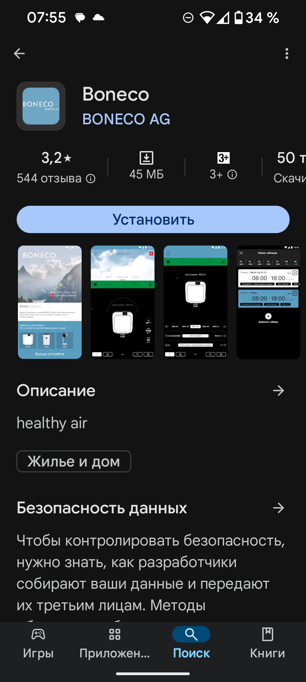 Для работы с воздухоочистителем производитель предлагает приложение Boneco собственной разработки.