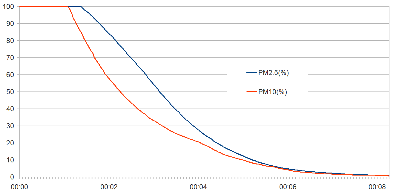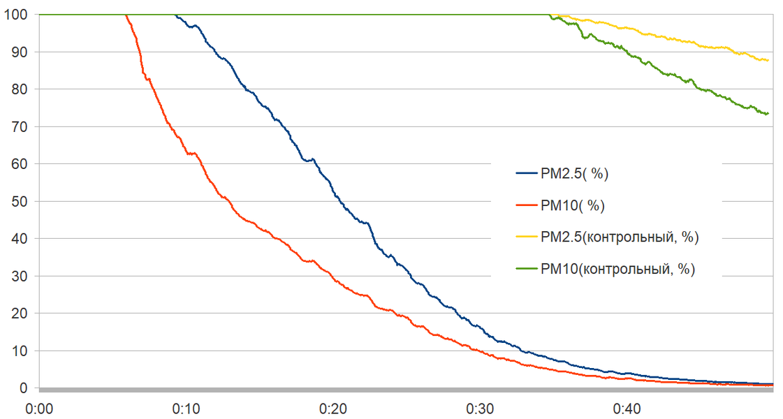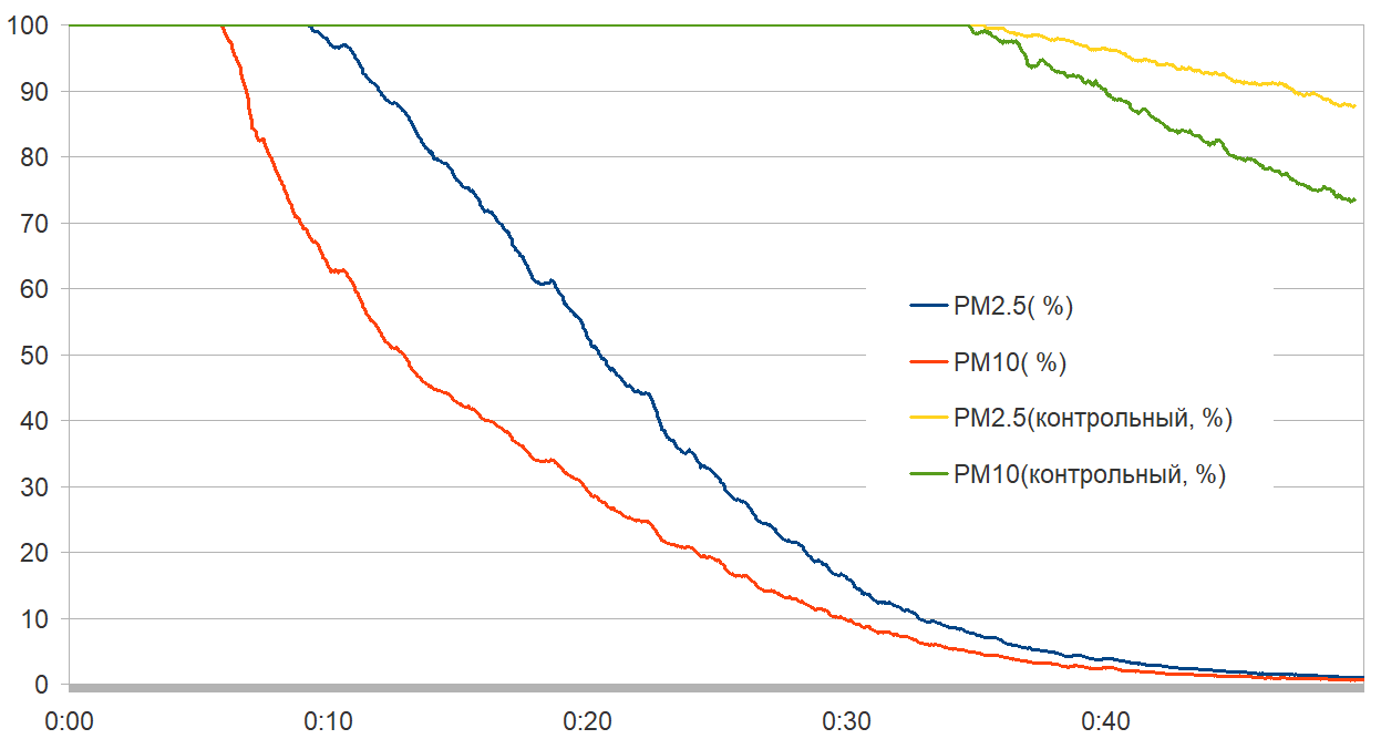 | Снижение загрязнения частицами PM2.5 на 50% от максимума, мин:сек | 3 минуты 21 секунда |