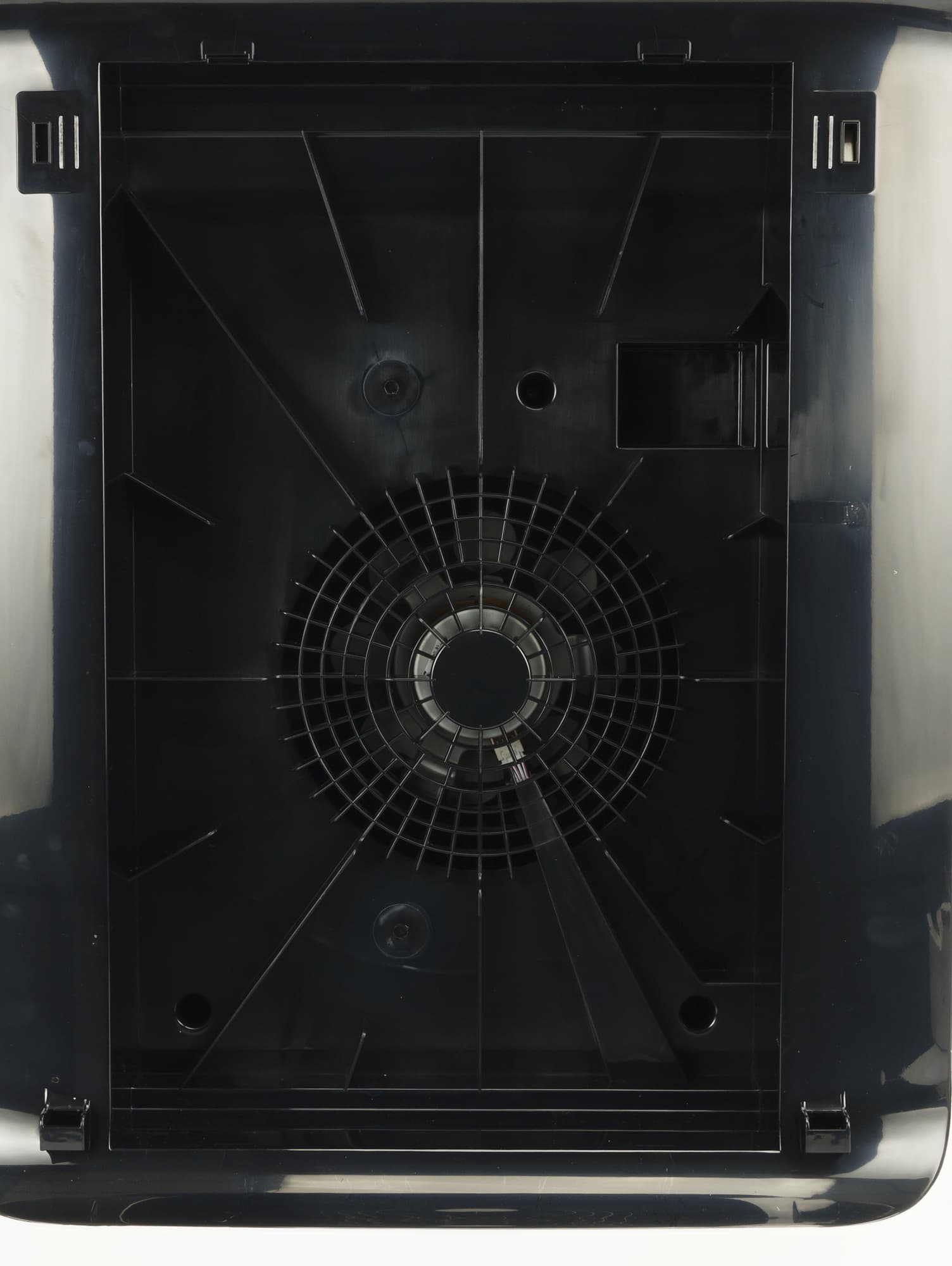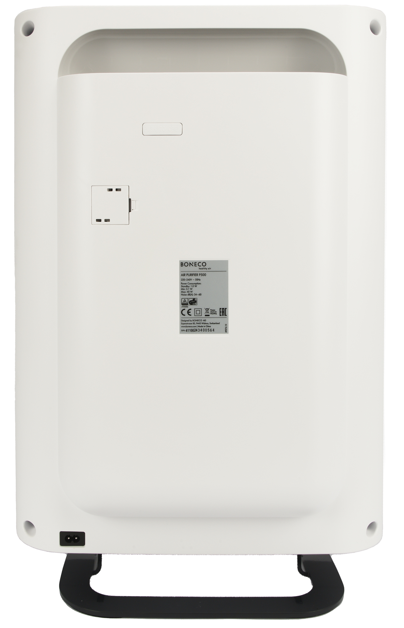 В левом нижнем углу задней панели располагается двухконтактная розетка для подключения электропровода. В центре расположен небольшой шильдик с обязательными техническими характеристиками изделия. Чуть выше отведено место для контейнера с ароматическим веществом и отсека для датчика качества воздуха.