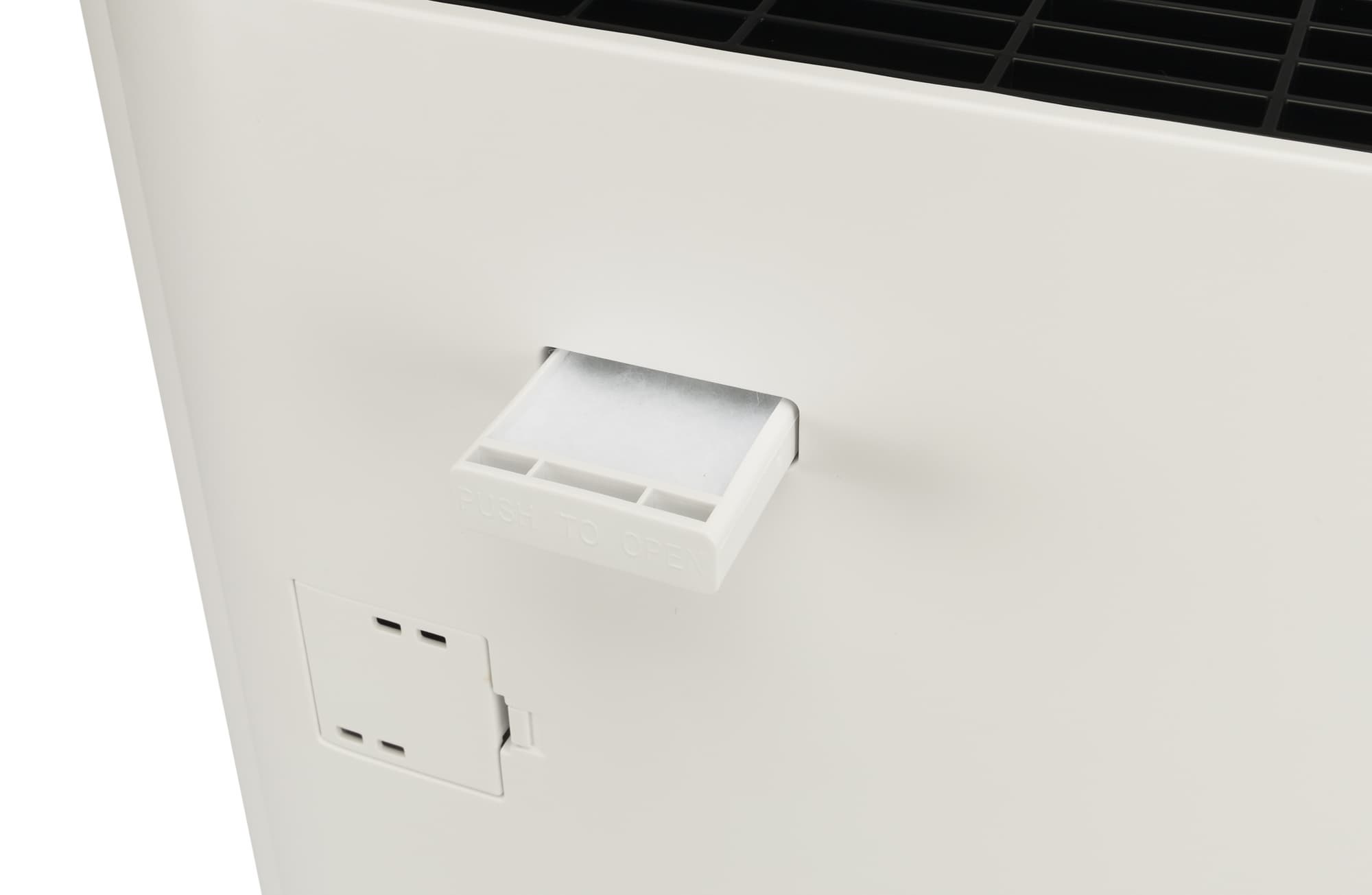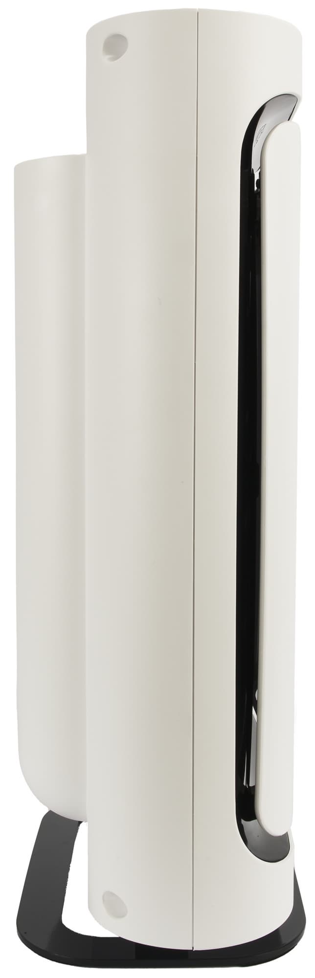 Корпус устройства сделан из матового белого пластика и имеет форму параллелепипеда со скругленными боковыми гранями. По периметру передней панели располагается воздухозаборная щель, отделанная гладкой черной пластмассой: воздух поступает в очиститель спереди.