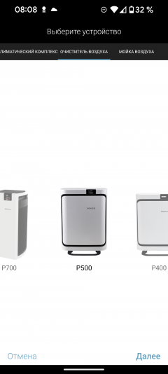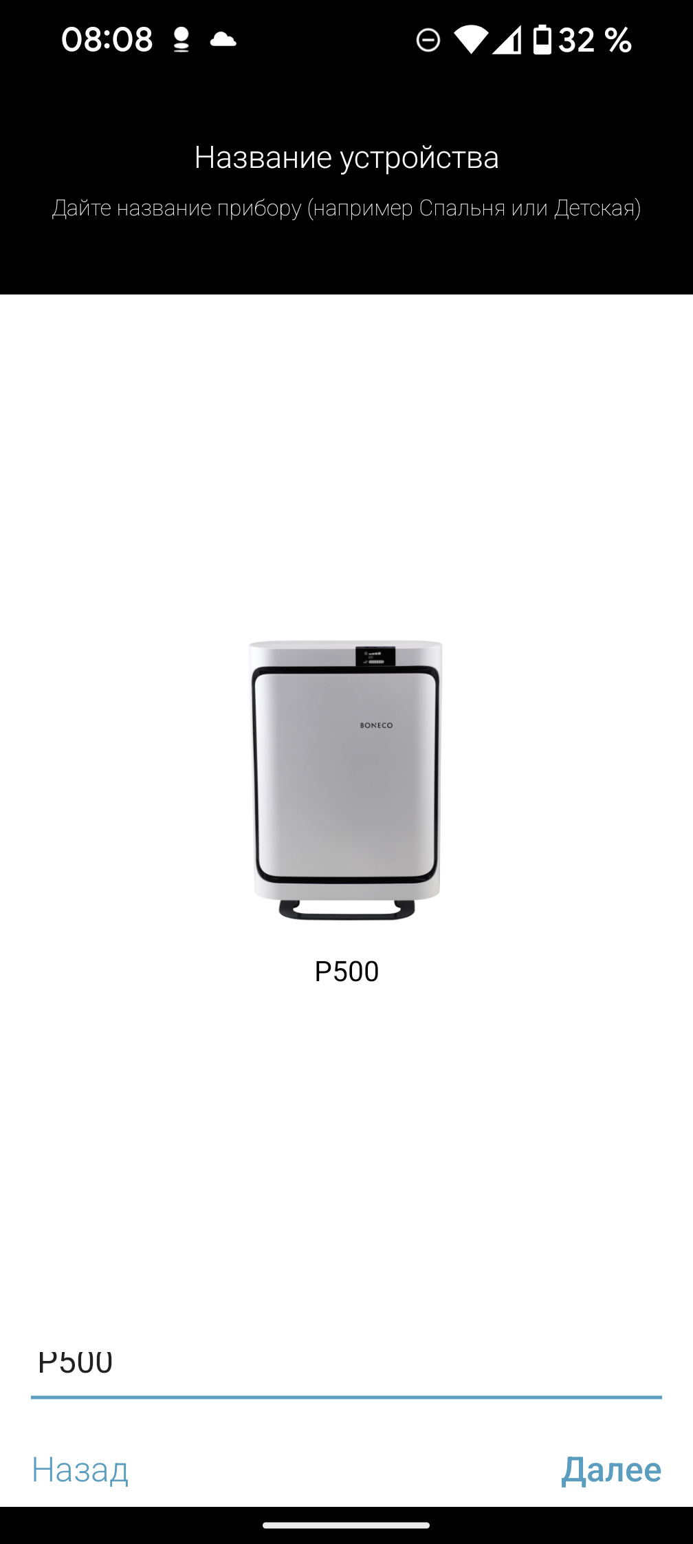 При первом запуске нам предлагается вручную найти Boneco P500 на вкладке «очистители воздуха» и переименовать его на случай, если в домохозяйстве имеется больше одного устройства этой модели.
