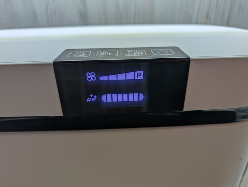 У устройства простое, удобное управление. Встроенный датчик качества воздуха обеспечивает эффективную работу в автоматическом режиме: воздухоочиститель увеличивает мощность только тогда, когда это действительно требуется. Жаль только, что показания сенсора выводятся на дисплей устройства лишь в виде относительной шкалы: знать точные значения концентрации взвешенных частиц было бы полезно.