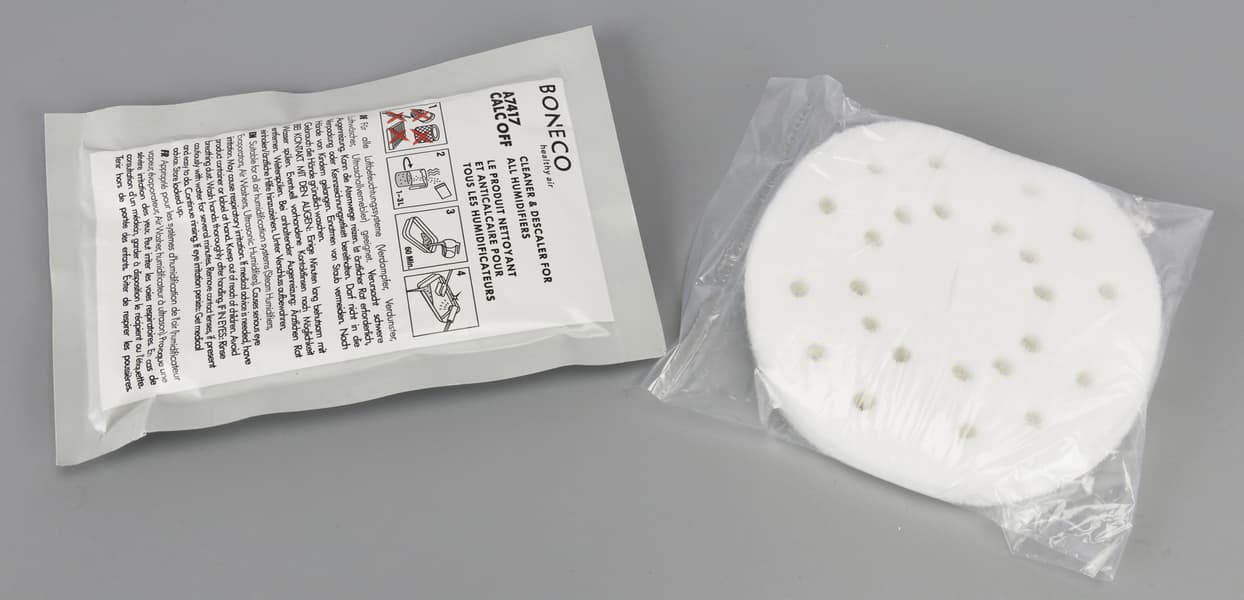 Паровой увлажнитель Boneco S450 укомплектован двумя противоизвестковыми дисками и пакетиком средства для очистки от накипи и известкового налета CalcOff. Диски изготовлены, похоже из нетканого материала. На дисках имеется большое количество перфорированных отверстий, крестообразный надрез по центру и четыре надреза по краю.