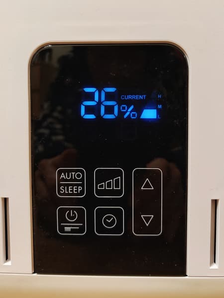 Включив увлажнитель на максимальной мощности и задав уровень желаемой влажности в 70%, мы оставили его в тестовом помещении и дождались сигнала о закончившейся в баке воде.