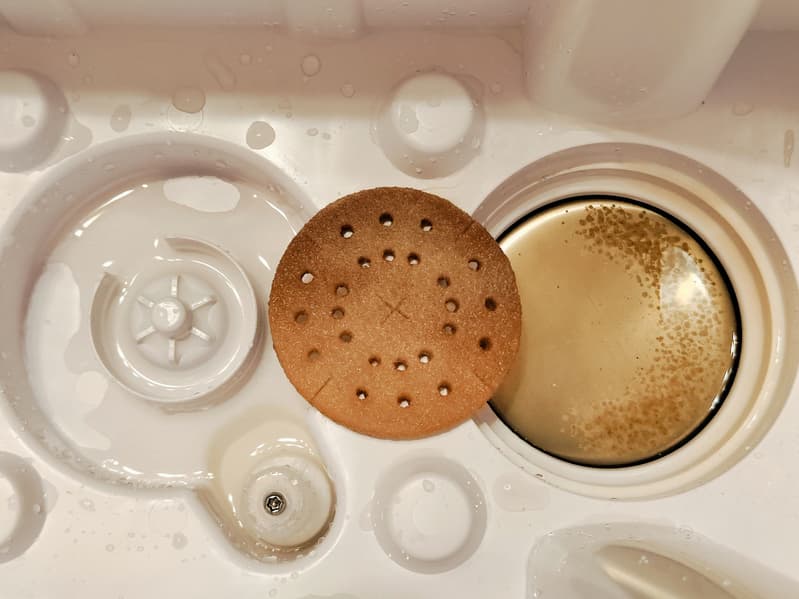 Противоизвестковый диск снижает образование накипи/известкового налета в камере парообразования и частоту проведения очистки от накипи. Диск попросту укладывается на металлическую часть — дно — камеры парообразования. В случае износа противоизвесткового диска его необходимо заменить (в результате накопления извести он затвердеет). Производитель указывает, что в зависимости от жесткости воды срок службы аксессуара составляет от 2 до 4 недель. Наша питерская вода заставила диск не затвердеть, а покоричневеть. Вода у нас не известковая, а ржавая. Неделя почти непрерывного использования не изменили мягкость диска, а вот на цвет повлияли самым негативным образом.