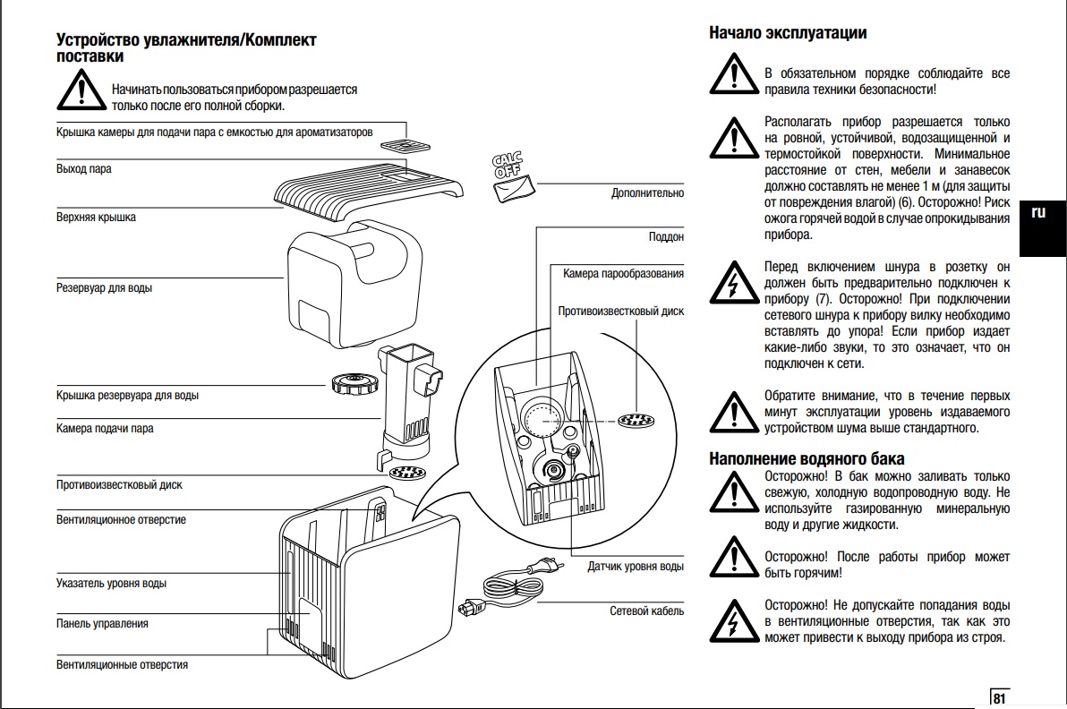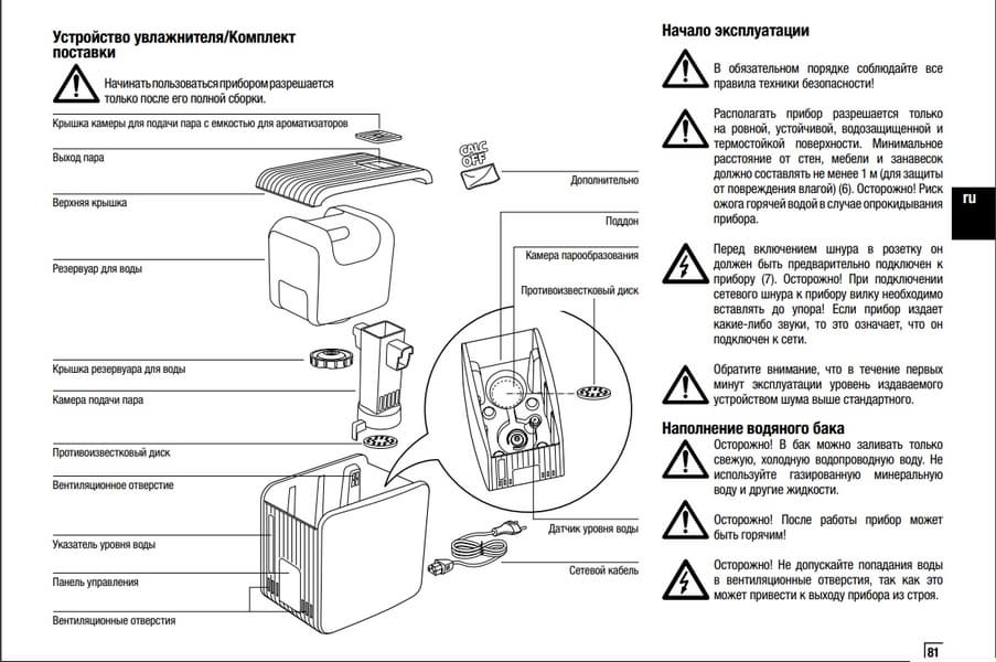 В кратком руководстве содержится минимум сведений: комплект поставки, эксплуатация и управление увлажнителем, значение символов на дисплее. В комплект документации входит также гарантийный талон и отдельный документ формата А6 — инструкция по мерам безопасности.