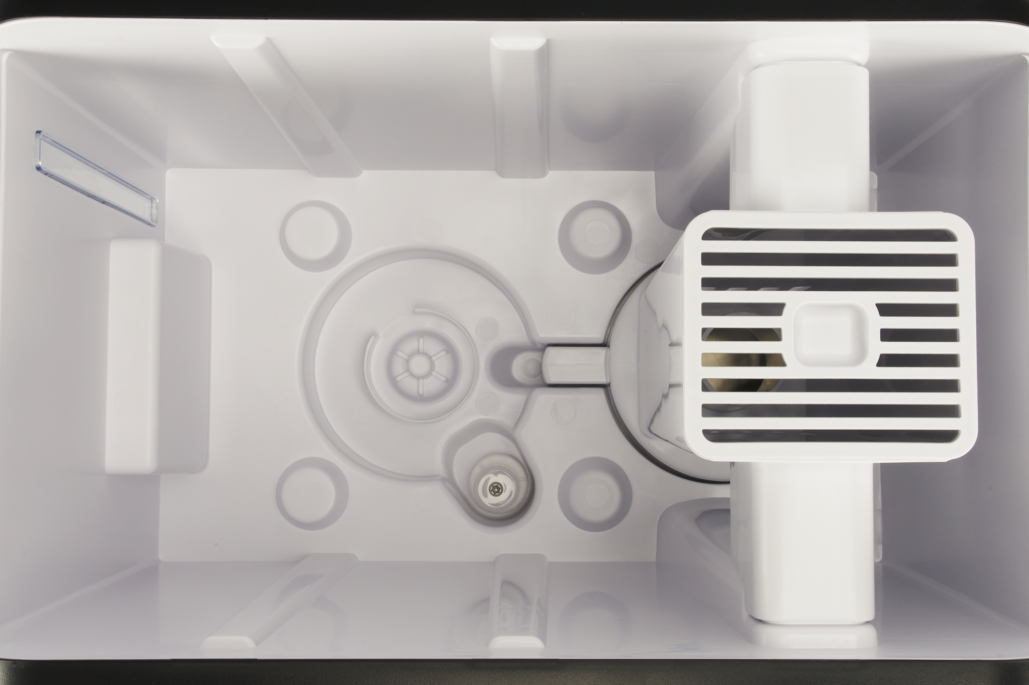 Потянув наверх за ручку, вытащим бак. Теперь можно внимательно рассмотреть внутреннюю камеру увлажнителя. Бо́льшую его часть ожидаемо занимает место размещения резервуара. Тут же, справа от него, расположен датчик уровня воды. Справа на фотографии — детали конструкции непосредственно парообразователя: камера парообразования и возвышающаяся над ней камера подачи пара. Всё довольно просто.