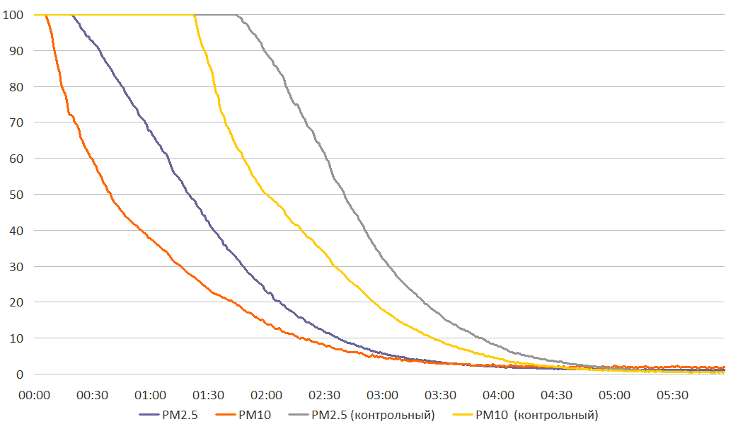 Второй раз мы напустили в помещение столько же дыма, но устройство не включали. Это позволило нам сравнить качество очистки воздуха прибором с естественной скоростью осаждения загрязнений. Полученные данные мы также представляем в виде графика.