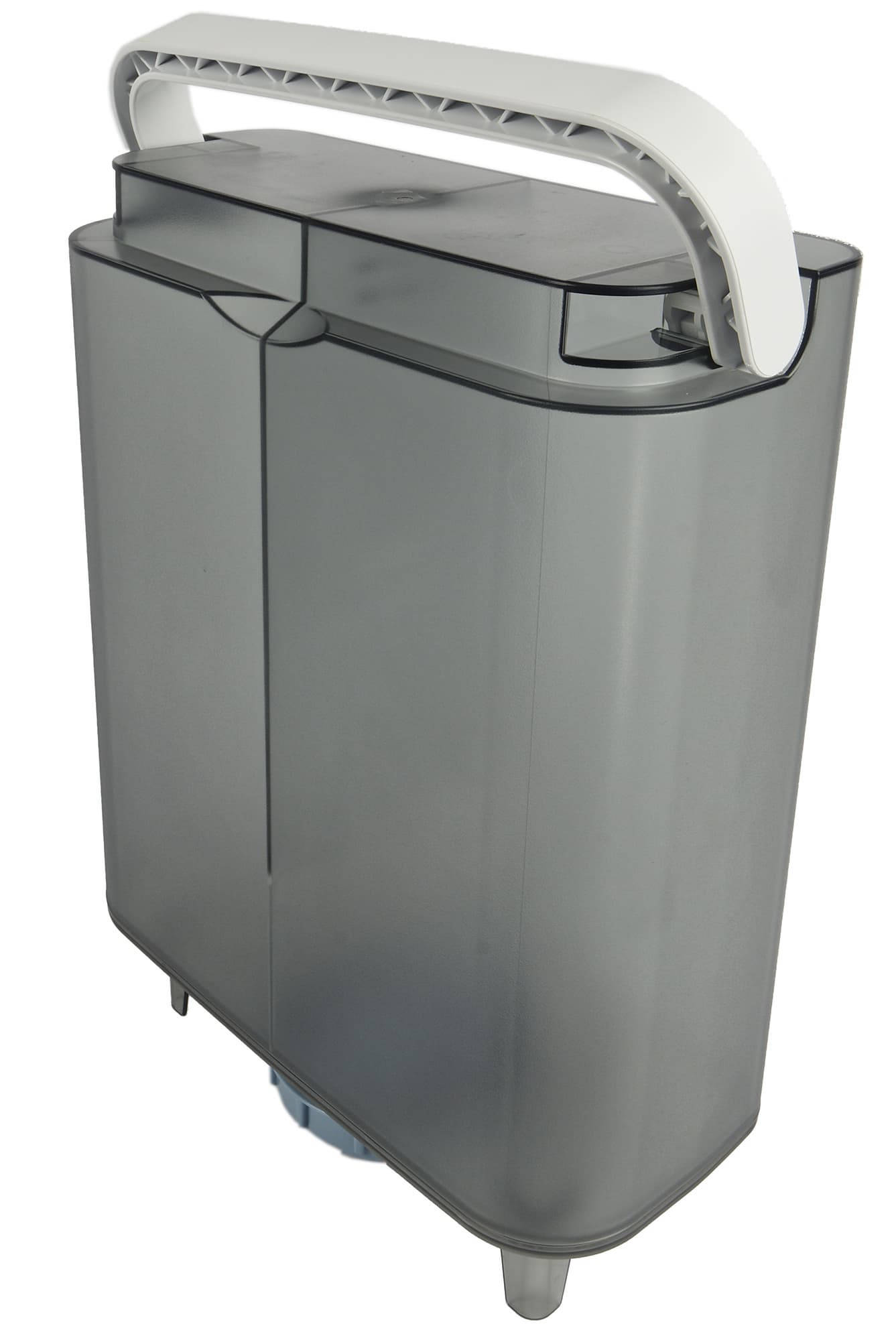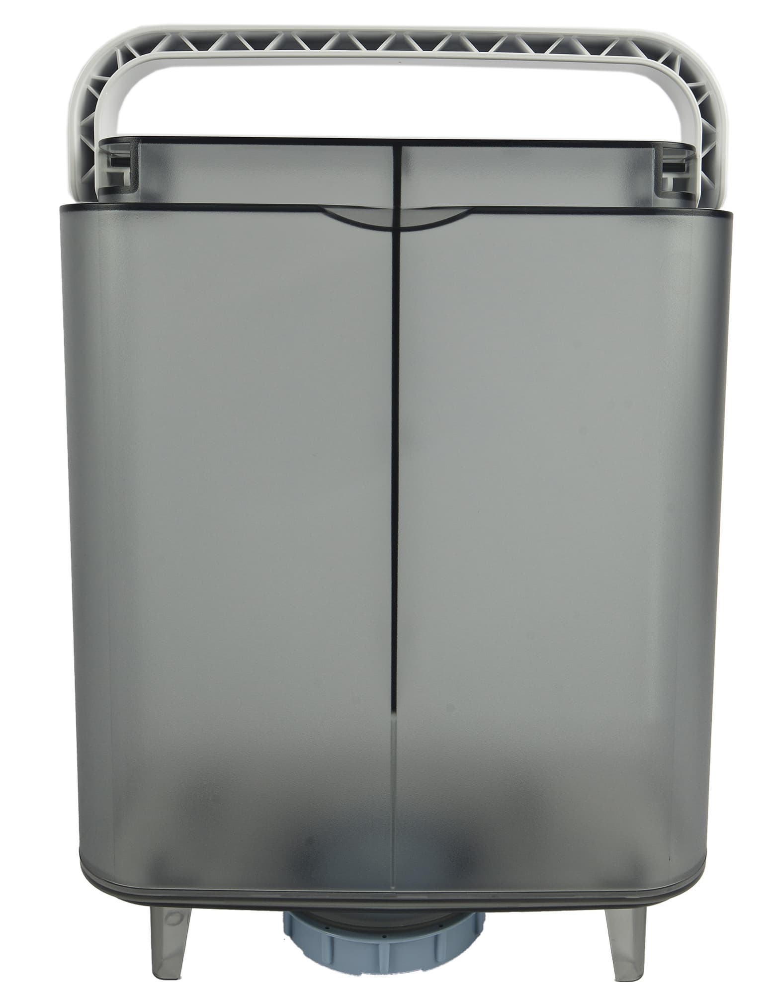 В задней части основания расположен съемный бак для воды, выполненный из серого полупрозрачного пластика и снабженный ручкой для удобства переноски.