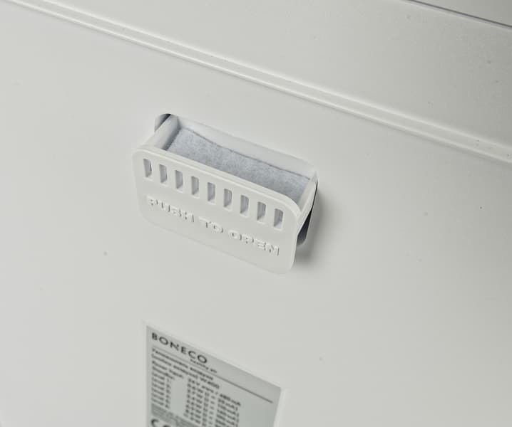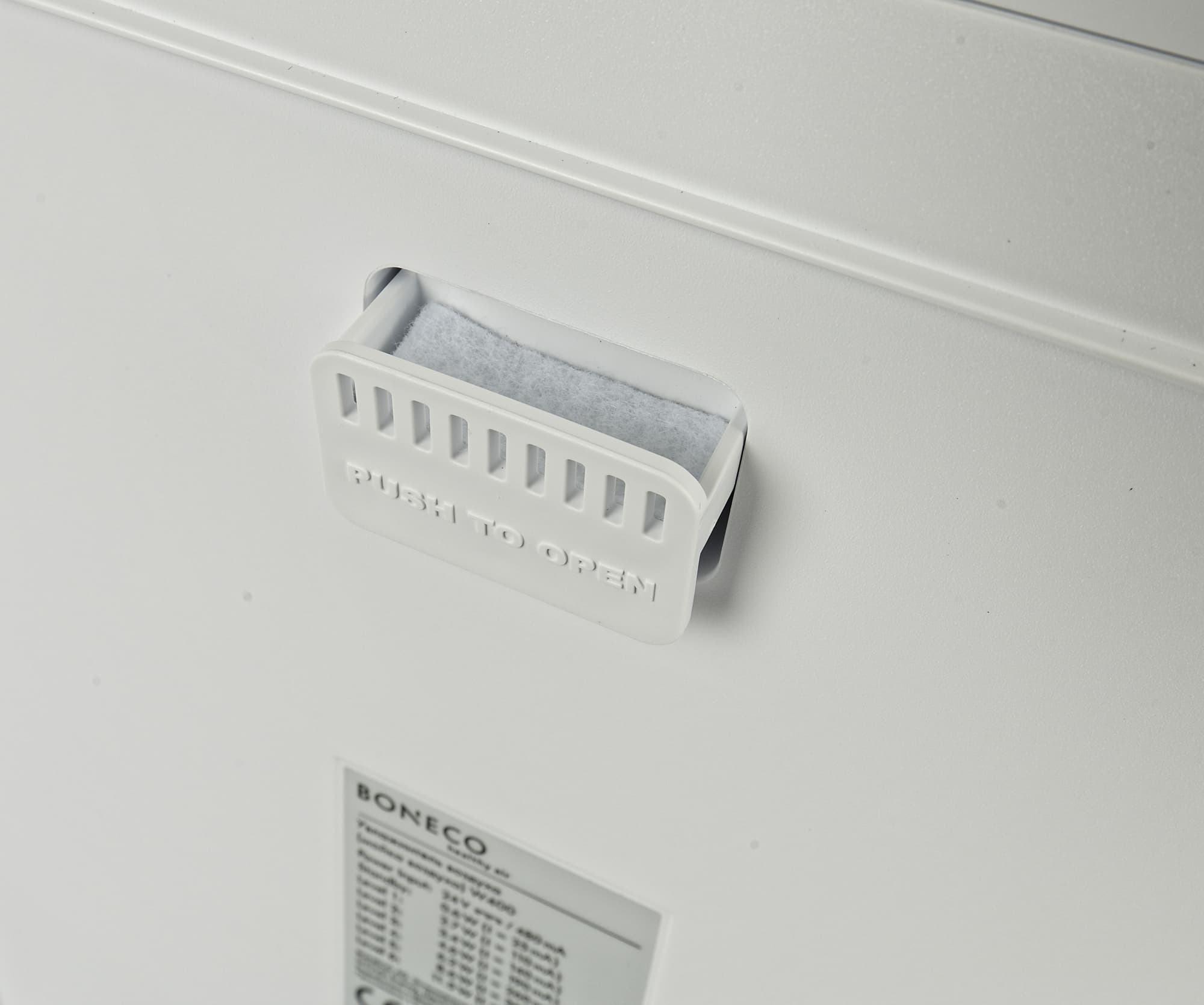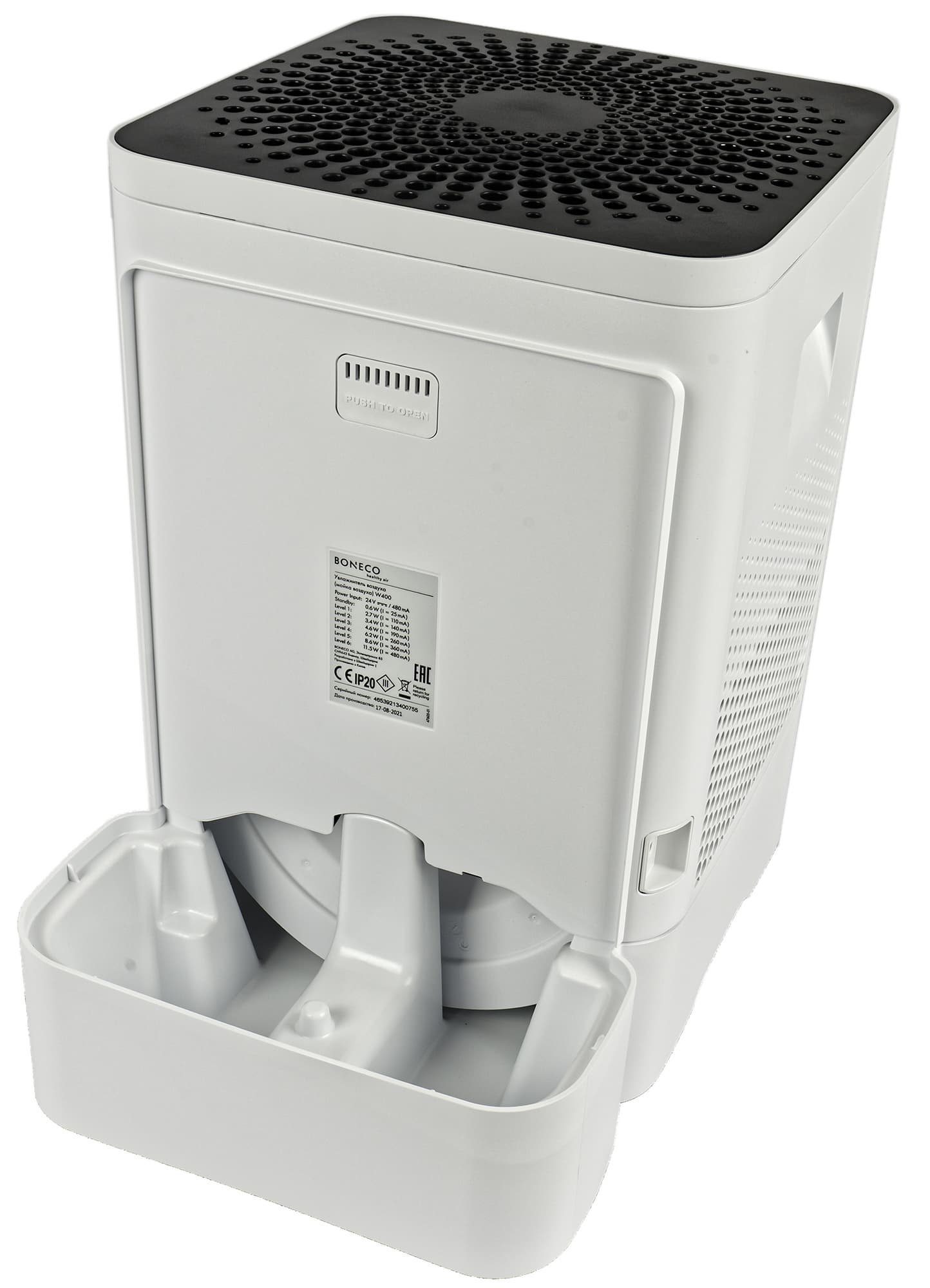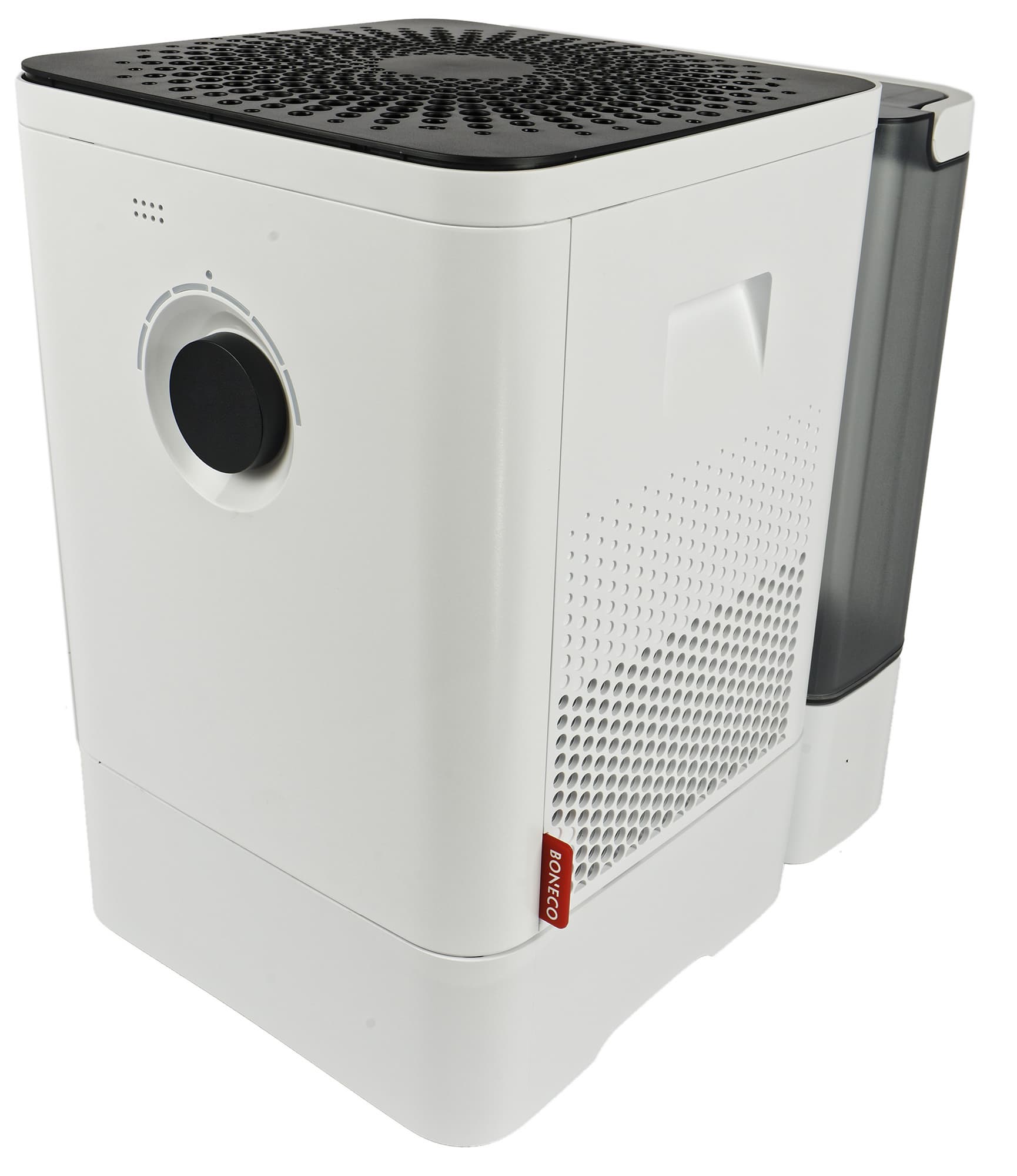 Эта модель оборудована противопылевым фильтром и заметно более мощным мотором, обеспечивающим более эффективное увлажнение. Прибор хорошо покажет себя в борьбе с домашней пылью, но взвешенным в воздухе микрочастицам он противостоит лишь немногим лучше, чем младшая модель: для радикального избавления от дыма, пыльцы и аллергенов предназначены устройства с фильтрами тонкой очистки. В линейке техники Boneco они представлены серией климатических комплексов, и в одном из следующих обзоров мы вас с ними познакомим.