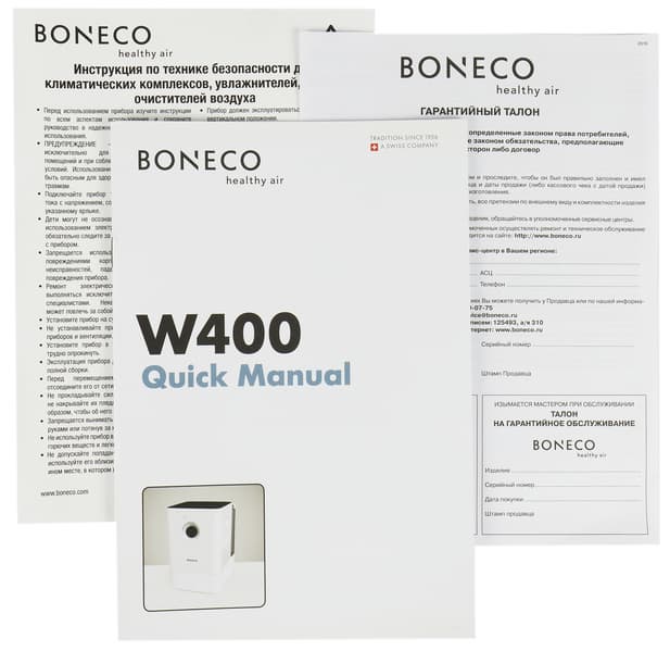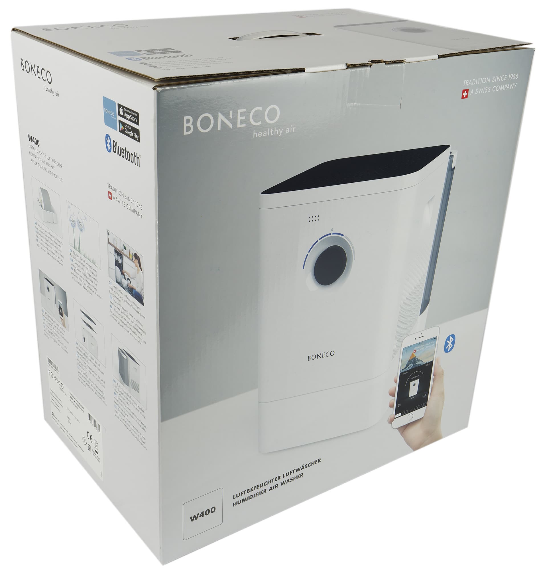 Boneco W400 выгодно отличается от младшей модели почти в три раза бо́льшим резервуаром, обеспечивающим длительную автономную работу, наличием встроенных термометра и гигрометра, возможностью управления и настройки включения и выключения по расписанию с помощью мобильного приложения.