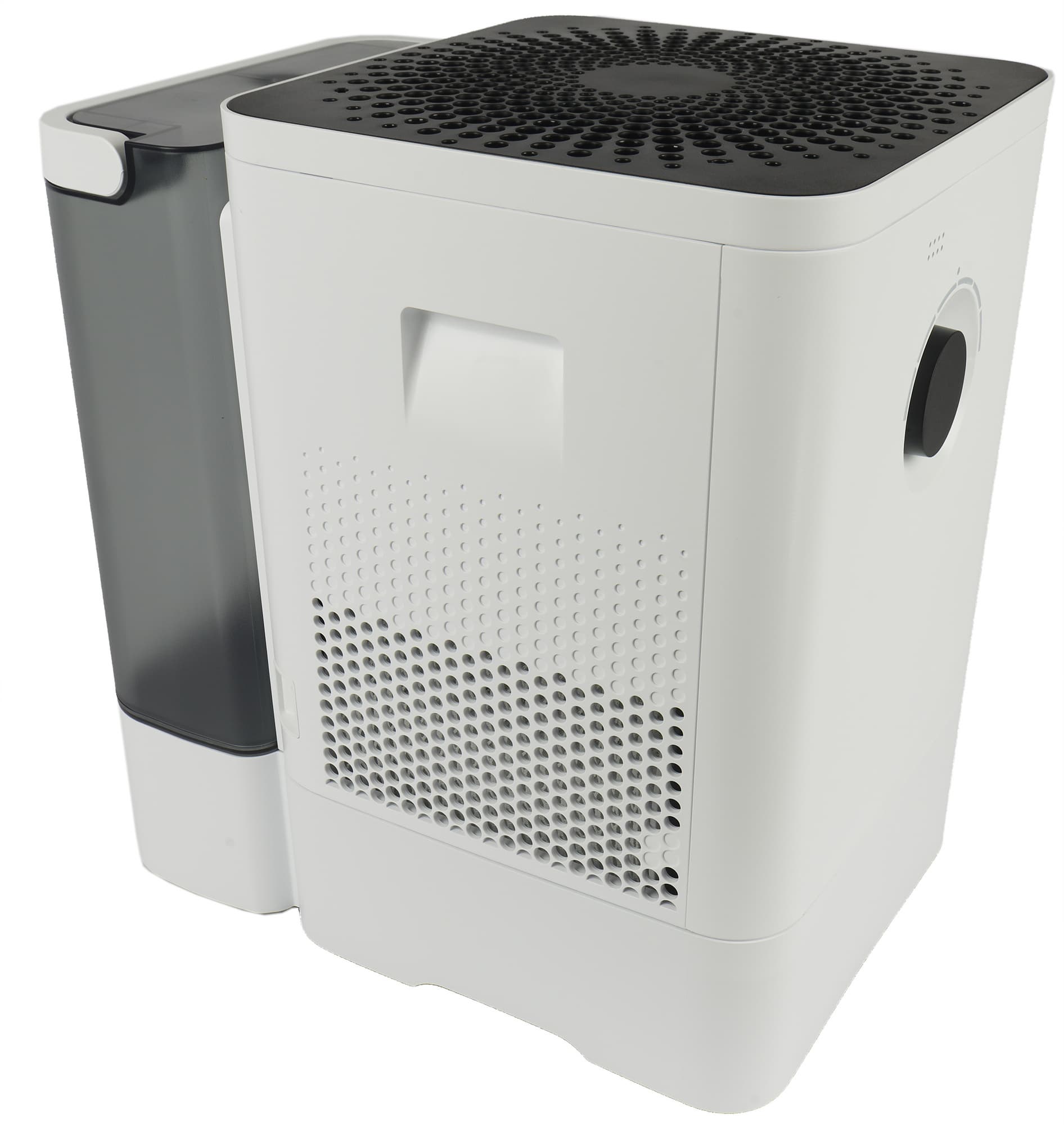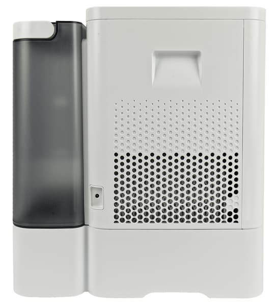 Белый пластиковый корпус устройства состоит из трех частей: моторного блока с панелью управления и пакетом воздушных фильтров, рабочей емкости с губчатым барабаном и съемного резервуара для воды.