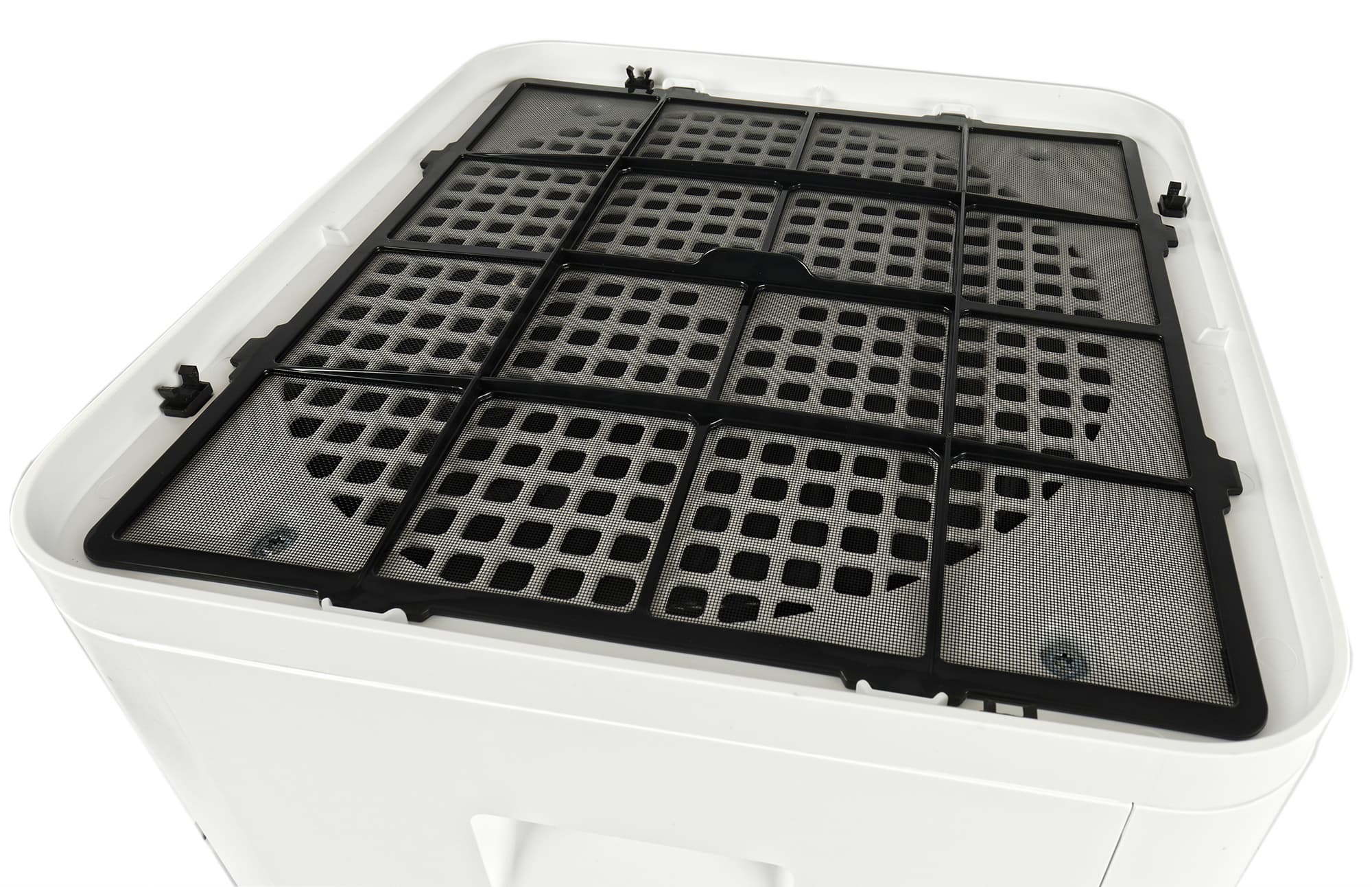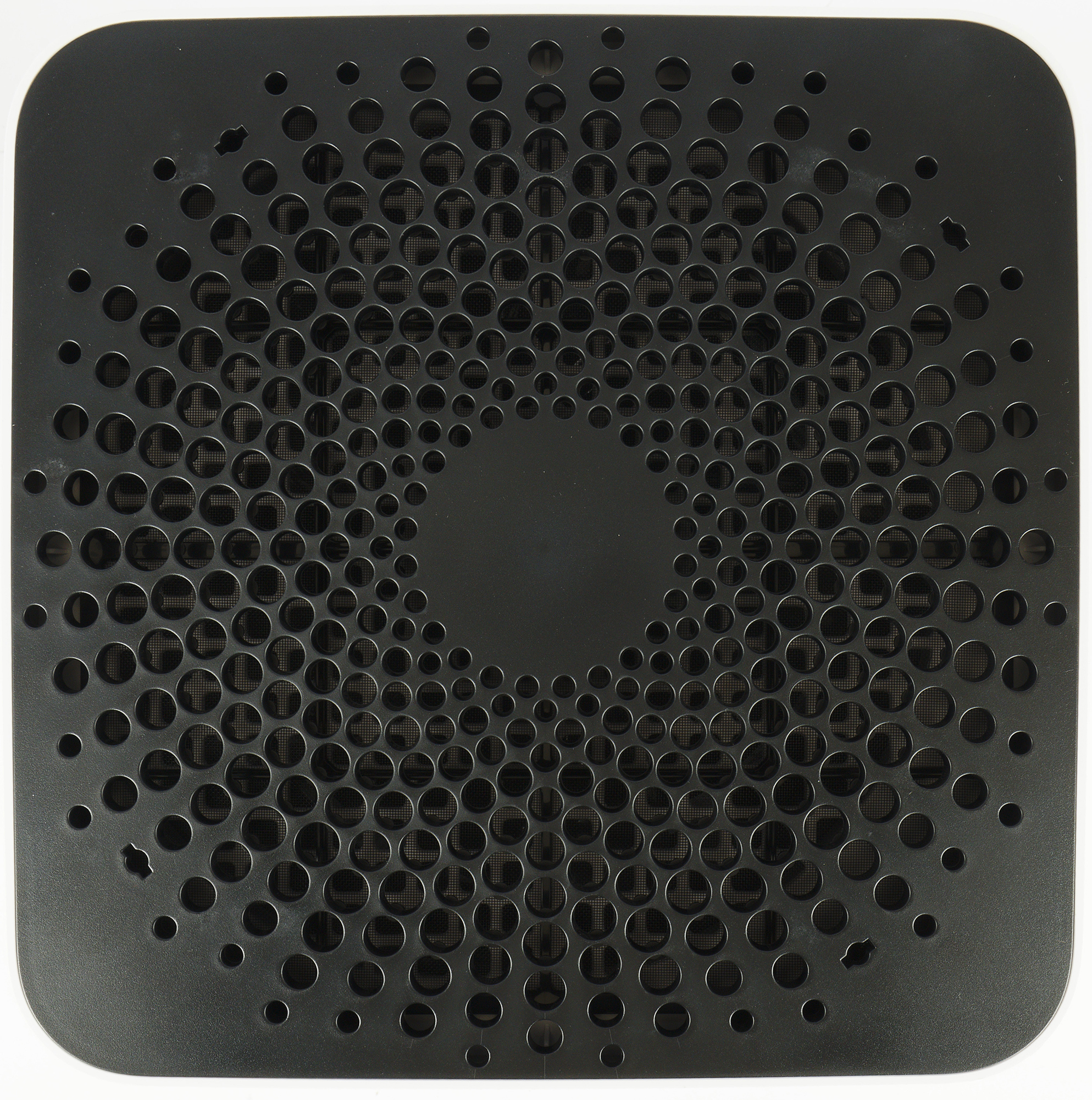 Верхняя вентиляционная решетка, через которую воздух попадает внутрь устройства, съемная. Чтобы ее открыть, следует поочередно нажать на боковые стороны пластикового квадрата: под ними размещены четыре защелки.