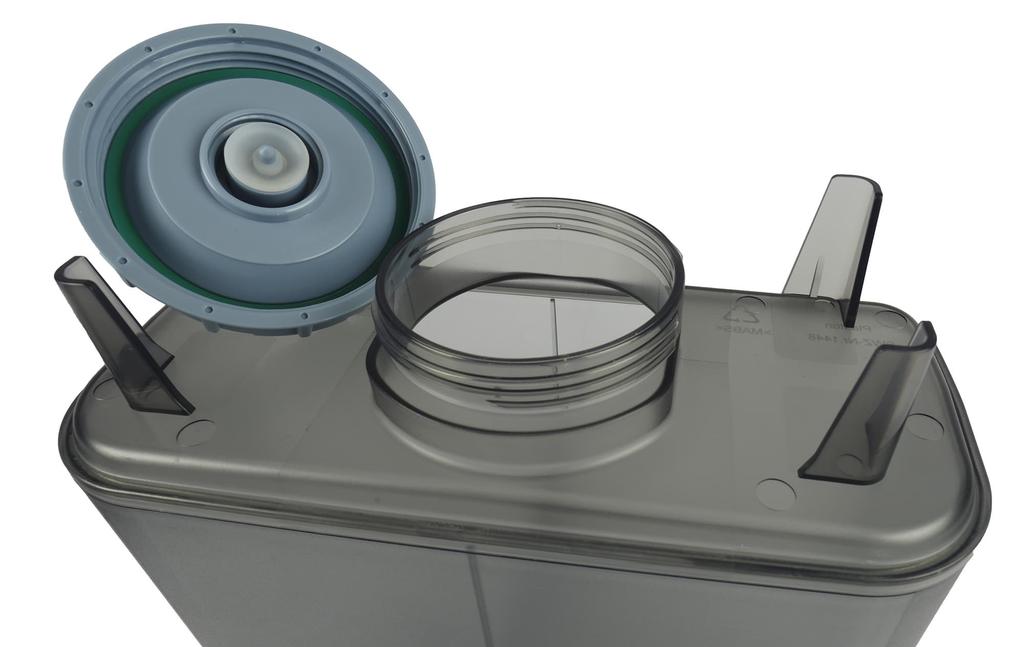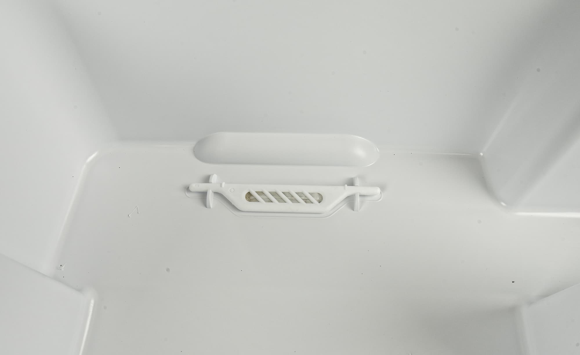 Помимо опор для барабана, в пластиковом резервуаре есть два контакта для контроля уровня жидкости (устройство автоматически отключается, если вода заканчивается) и специальный картридж, насыщающий содержимое бака ионами серебра. Рядом с контактными пластинами размещен выступ — это отметка максимального уровня жидкости, и выше нее заливать воду не рекомендуется.