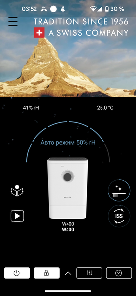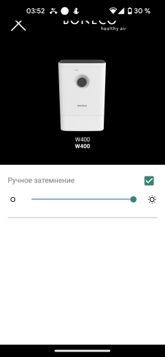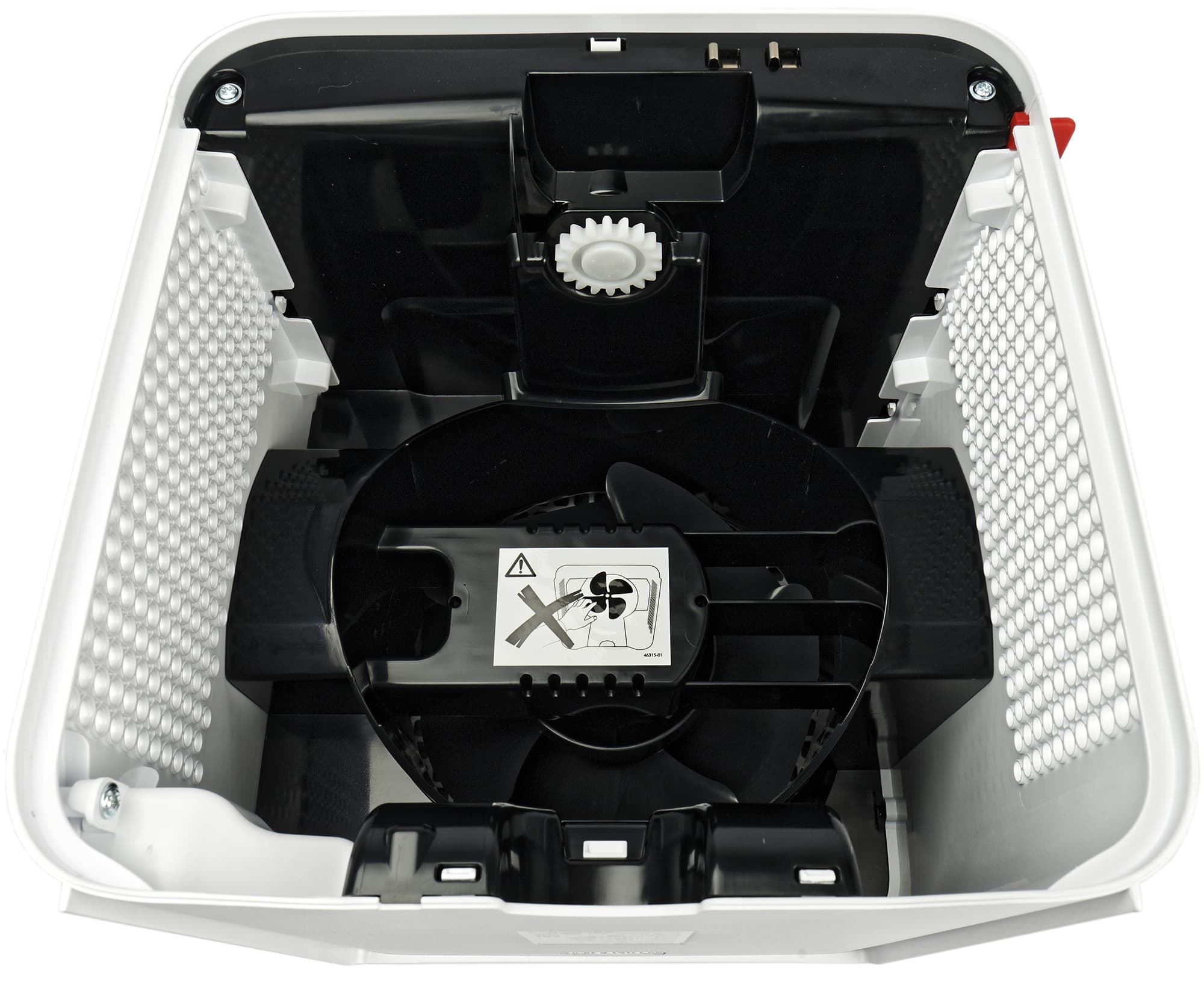 Устройство запускается в автоматическом режиме, самостоятельно выбирая мощность в зависимости от влажности воздуха в помещении. При необходимости программу можно выбрать вращением ручки: у Boneco W400 шесть уровней интенсивности. Текущий режим работы отображается на полукруглом шестисегментном индикаторе с голубой подсветкой.
