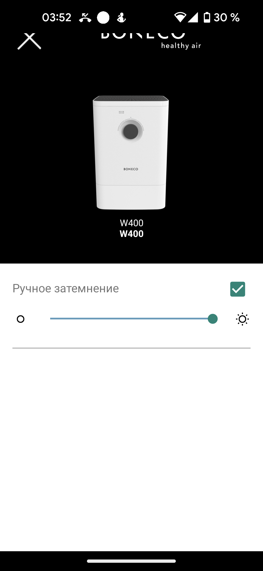 Чуть выше и левее рукоятки расположены отверстия, за которыми скрыт датчик температуры и влажности. У модели W400 нет индикации текущих параметров воздуха — их можно узнать только в мобильном приложении.