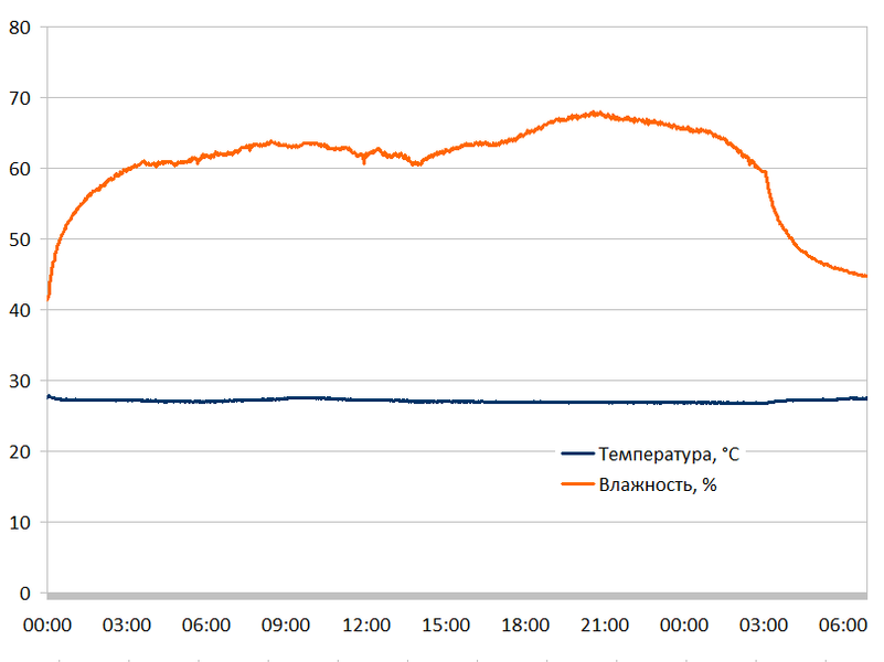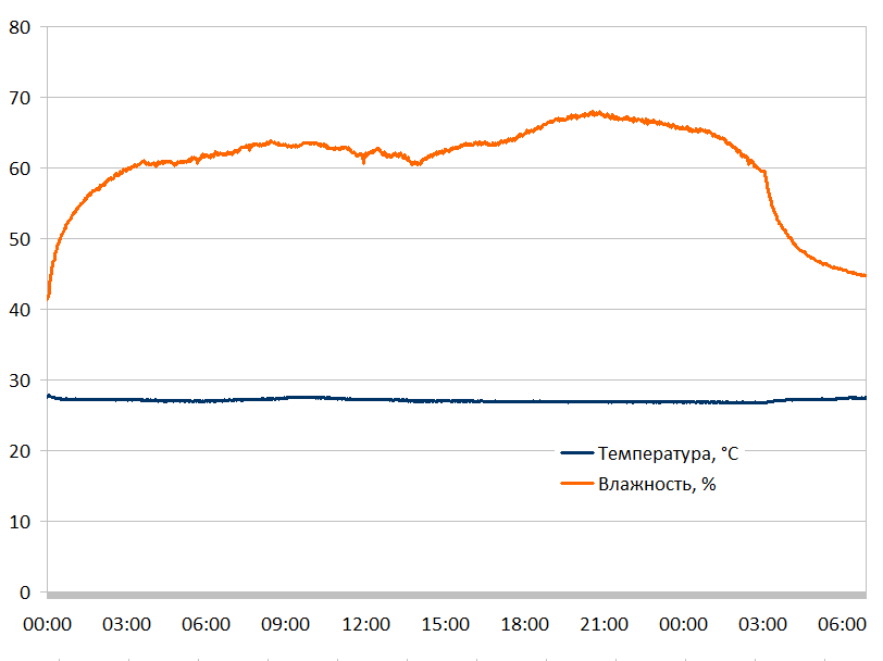 За первые семь часов прибор плавно поднял влажность в помещении с 42% до 64%-65%, а ближе к концу теста она достигла весьма неплохих 67%. После того, как вода в резервуаре закончилась, мойка воздуха отключилась, а влажность стала довольно быстро снижаться, пока не достигла исходного значения.