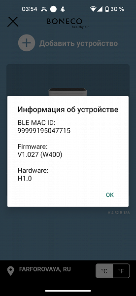 В разделе информации приложение дает возможность узнать MAC-адрес BLE-интерфейса, версии программного и аппаратного обеспечения.