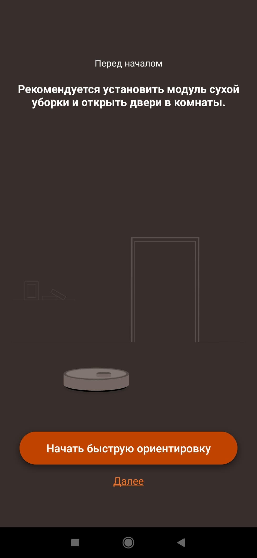 При первом запуске нужно обязательно установить модуль для сухой уборки. Это нужно чтобы создать карту дома, включающую в себя зоны с ковровым покрытием.