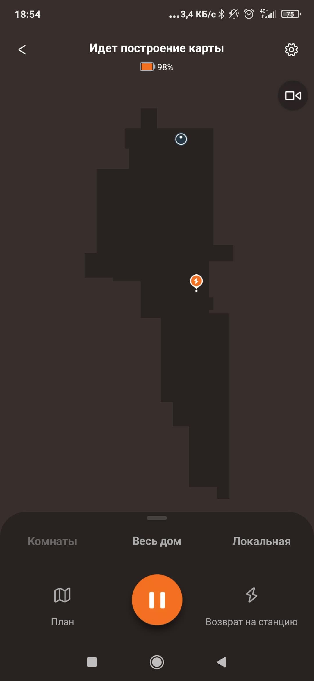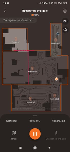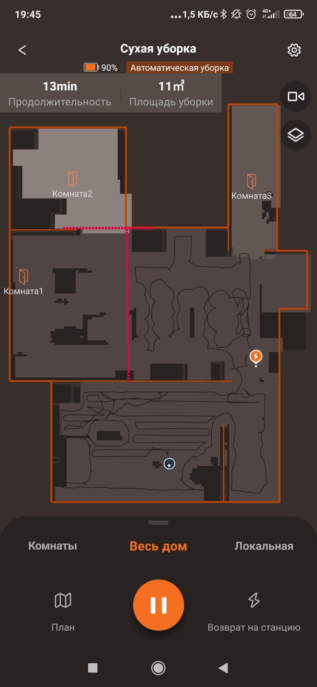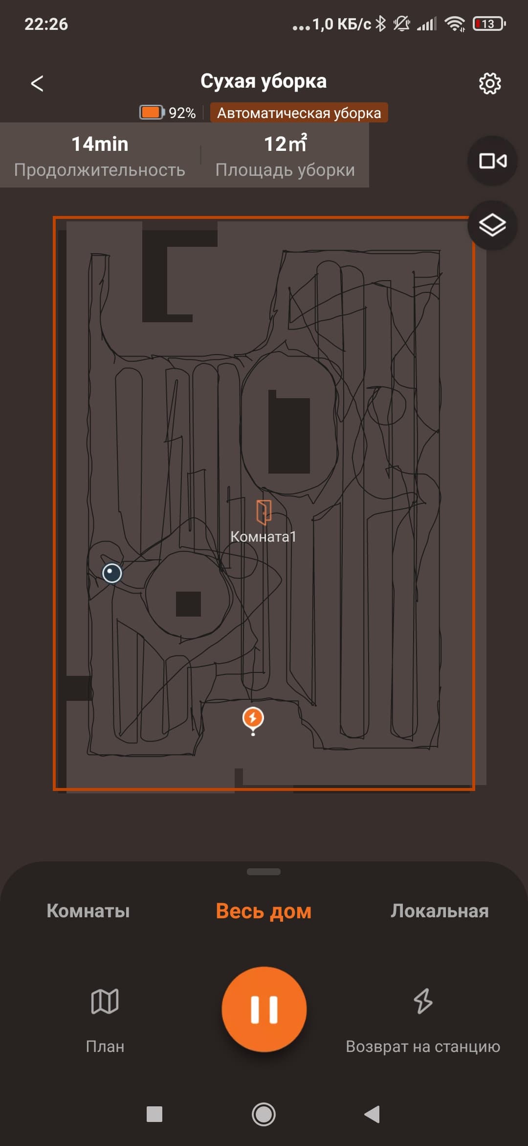 Эта же кнопка позволяет поставить уборку на паузу, а при длительном нажатии отправит его на зарядную станцию.
