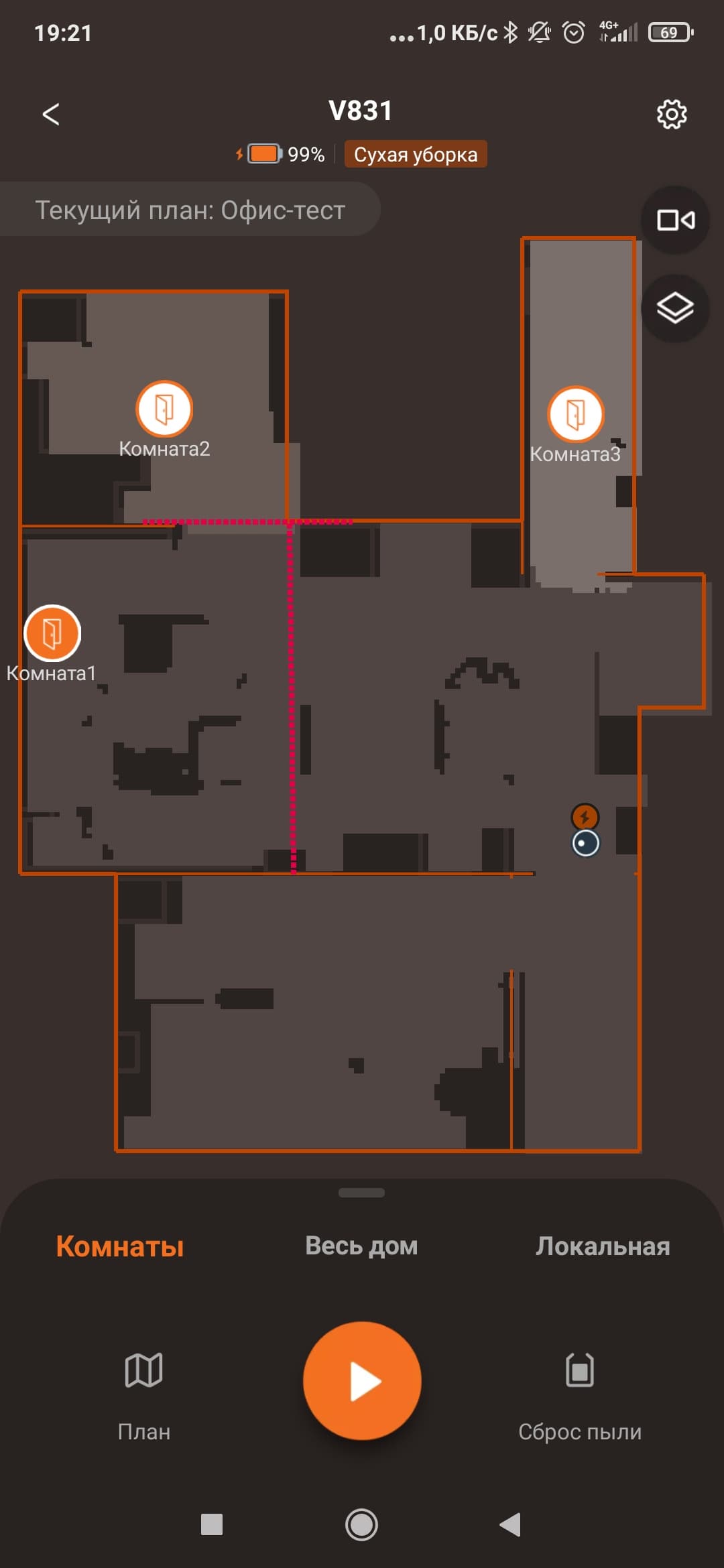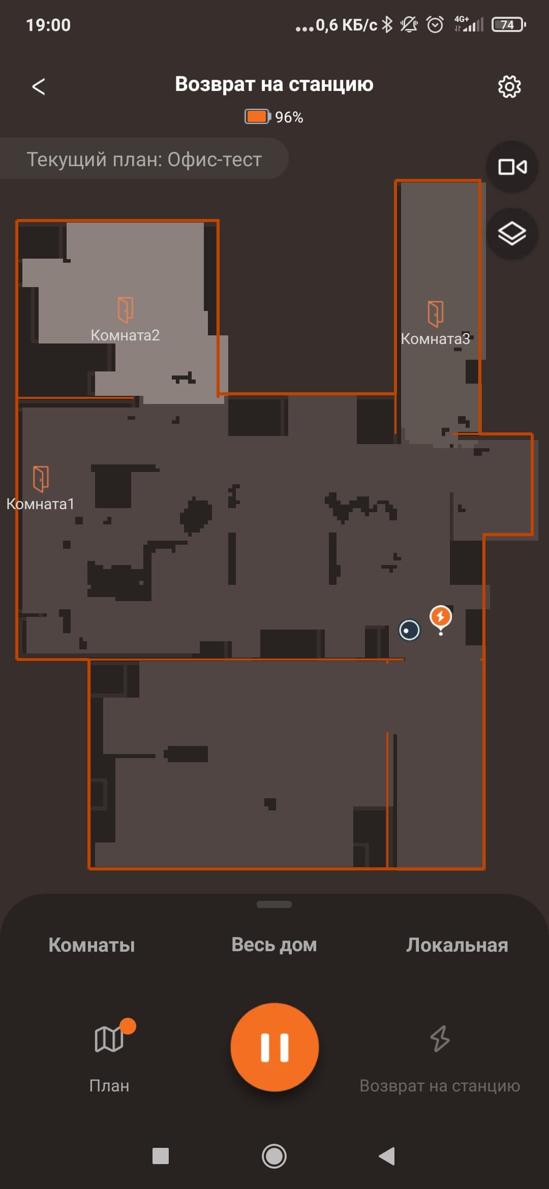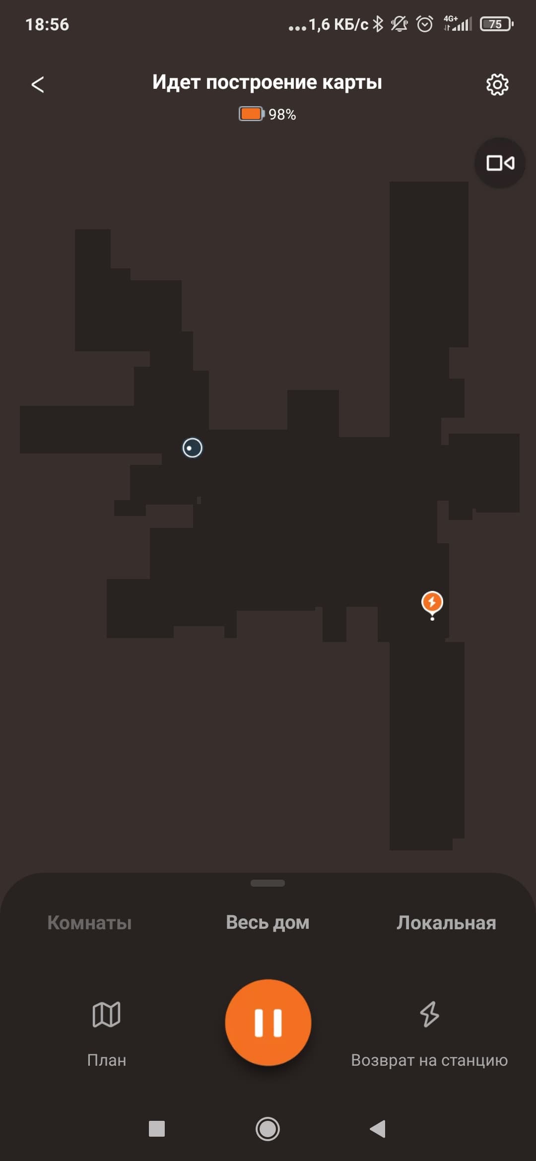 Эта же кнопка позволяет поставить уборку на паузу, а при длительном нажатии отправит его на зарядную станцию.