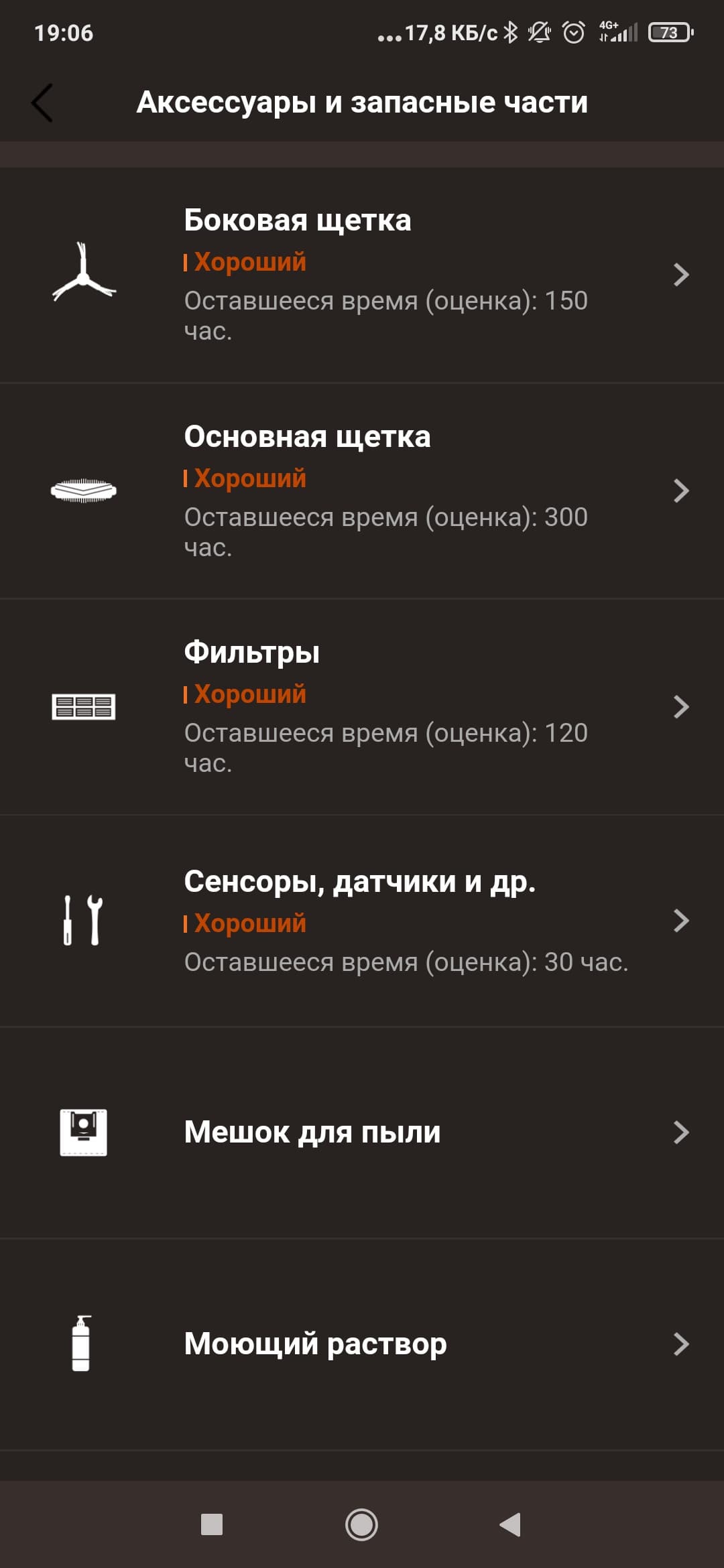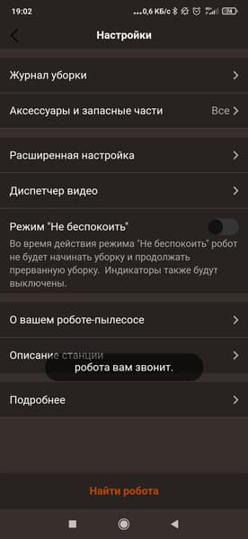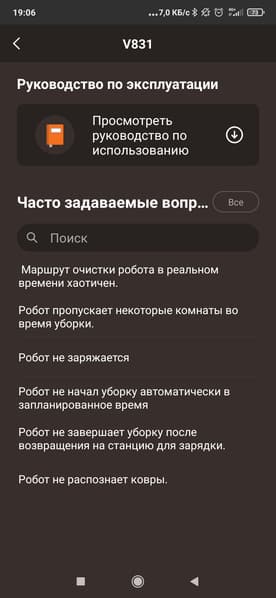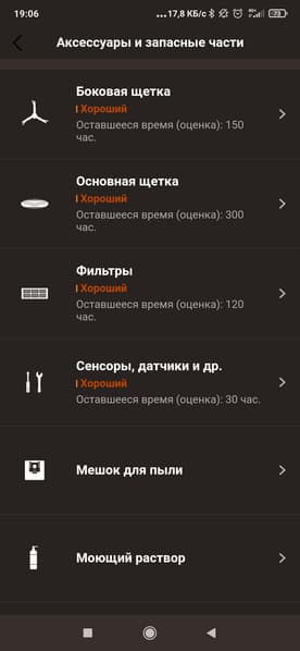 В недрах настроек мы найдем довольно стандартный набор опций. Тут мы можем посмотреть журнал уборок, обновить прошивку, проследить за износом щеток, фильтров и прочих аксессуаров, а также узнать ответы на часто задаваемые вопросы.