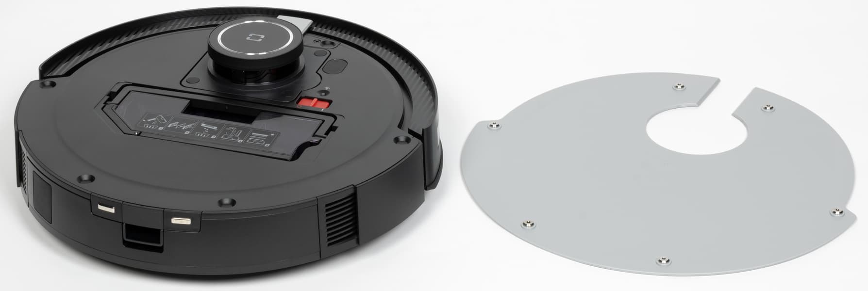 Итак, первое, на что мы обращаем внимание — это на корпус. Он выглядит на твердые пять баллов. Передний бампер, который служит датчиком столкновений, имеет симпатичную штриховку. Башенка лидара — кольцо, окрашенное под металл. Пластиковая верхняя панель окрашена под матовый металл. И тут же мы сталкиваемся с первым нюансом — верхняя панель не откидывается, как это обычно принято у бюджетных моделей, а снимается полностью. Крепится она на шесть магнитов, благодаря чему снять и установить ее обратно будет очень легко.