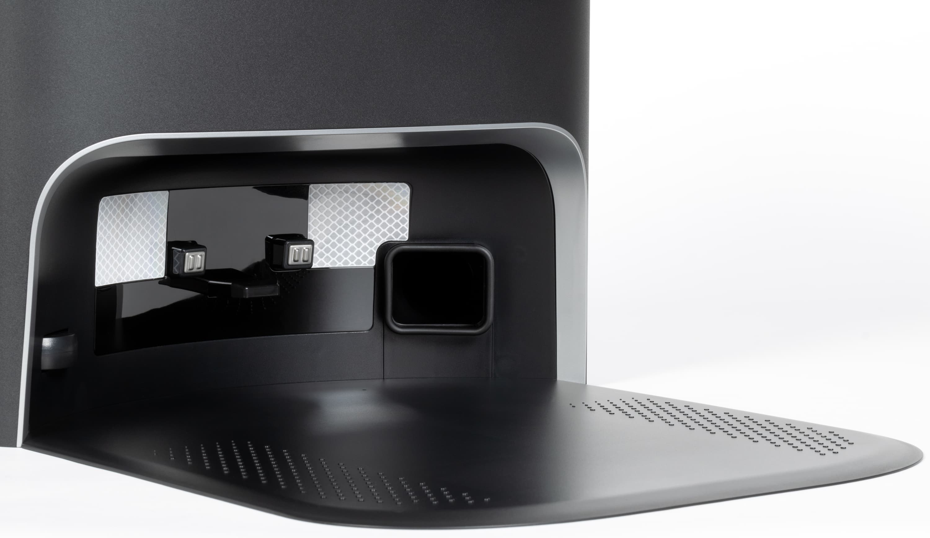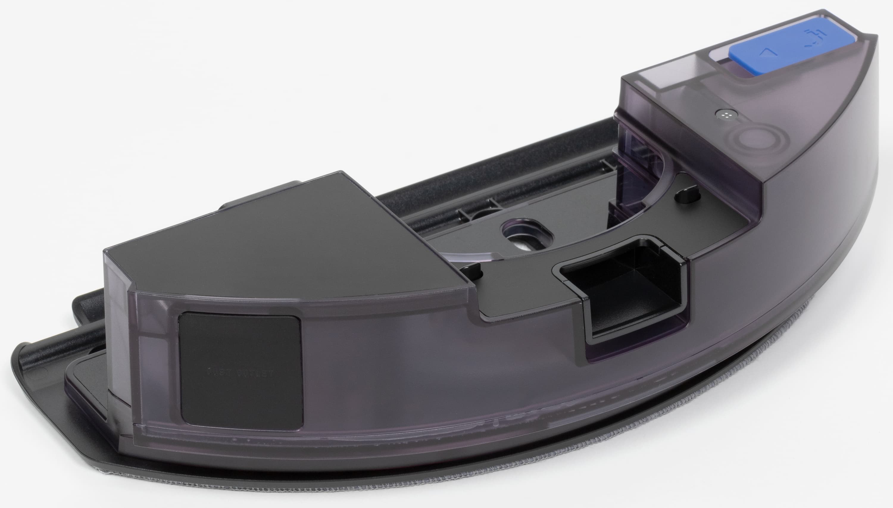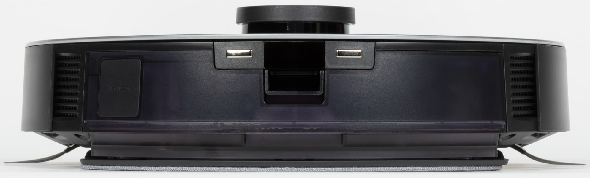 С тыльной стороны мы видим порт для сброса пыли (слева, закрыт подвижной резиновой заглушкой) и контакты для подзарядки (по центру). Также сзади устанавливается модуль для сухой уборки (через него осуществляется сброс пыли), либо модуль для влажной уборки.