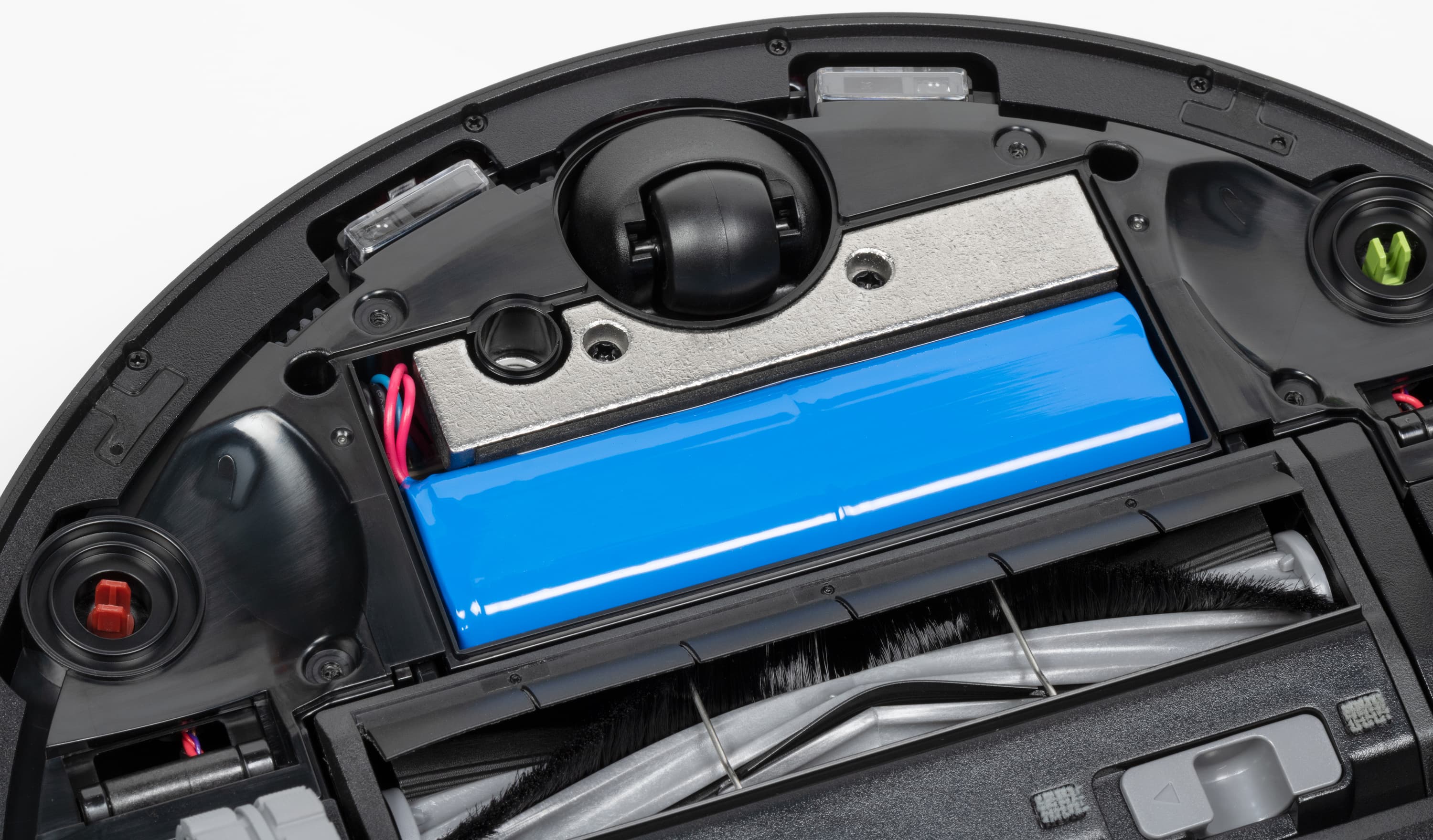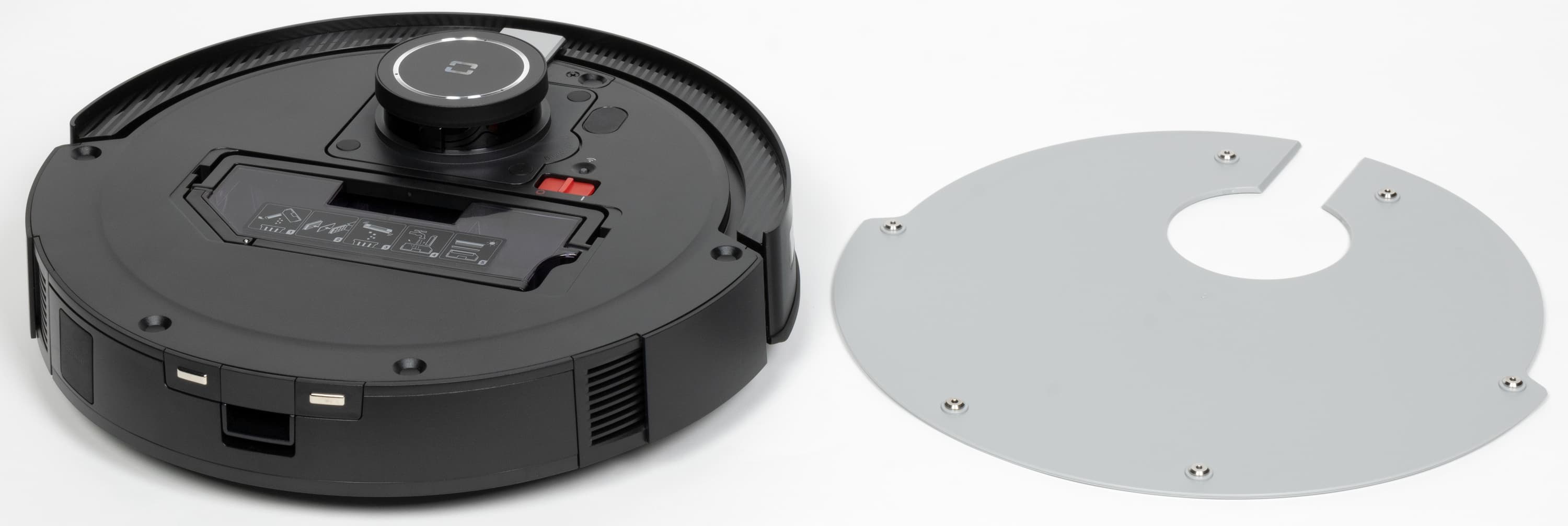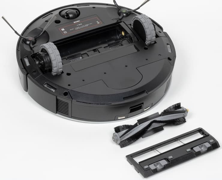 Перевернув робота, мы увидим вполне классическую конструкцию. Сразу замечаем расположенные по периметру шесть датчиков высоты, а по центру — датчик распознавания ковров (он находится слева от центрального колеса).
