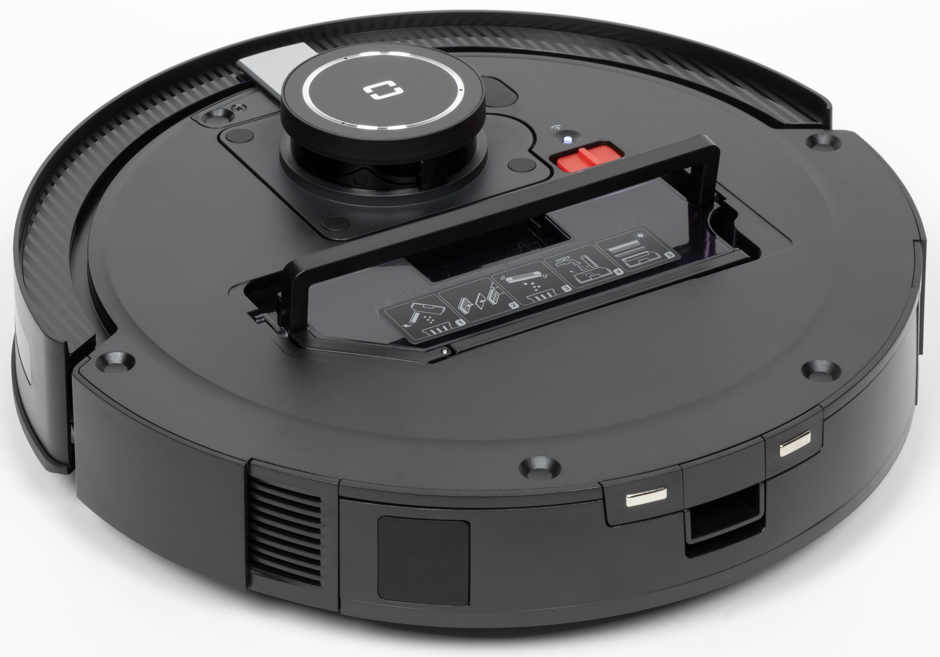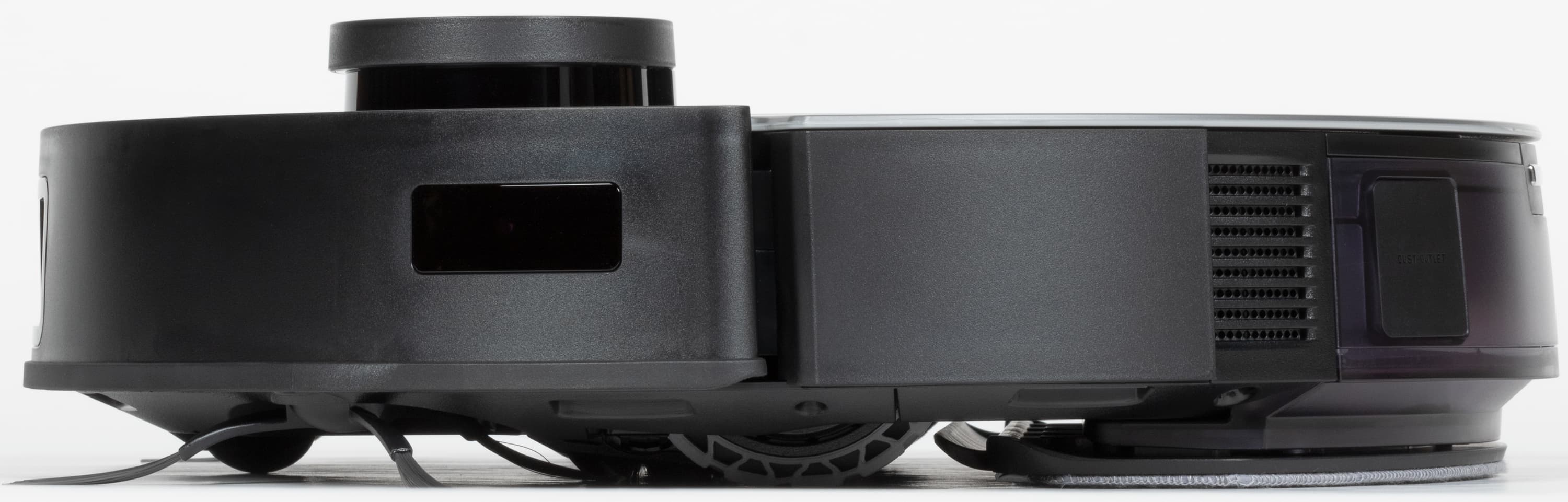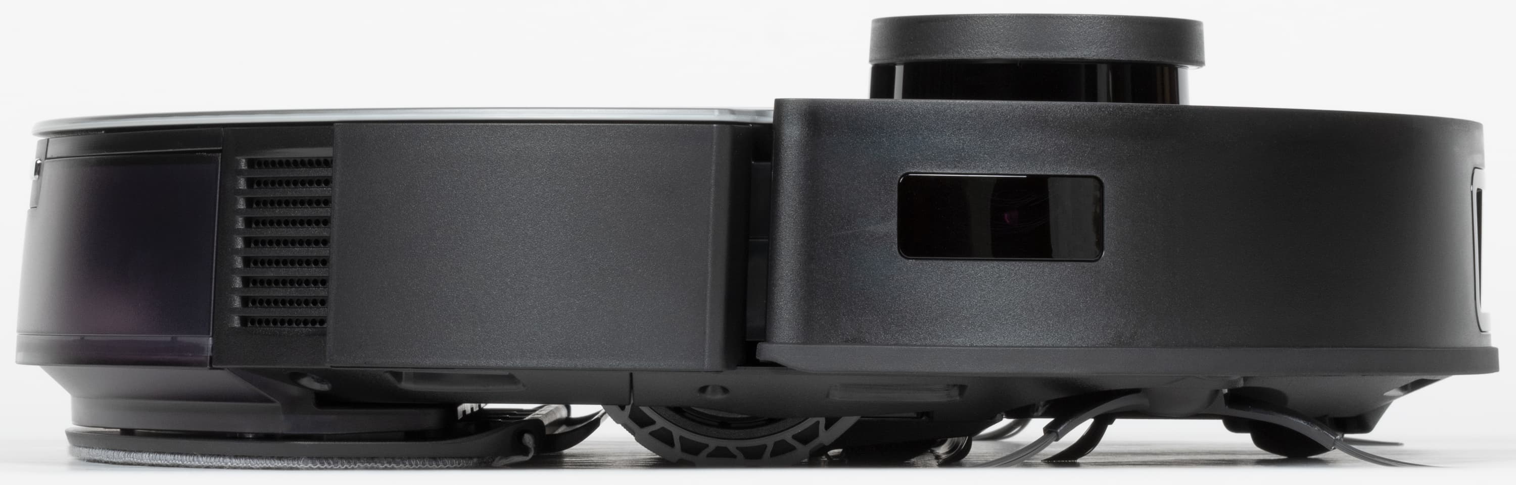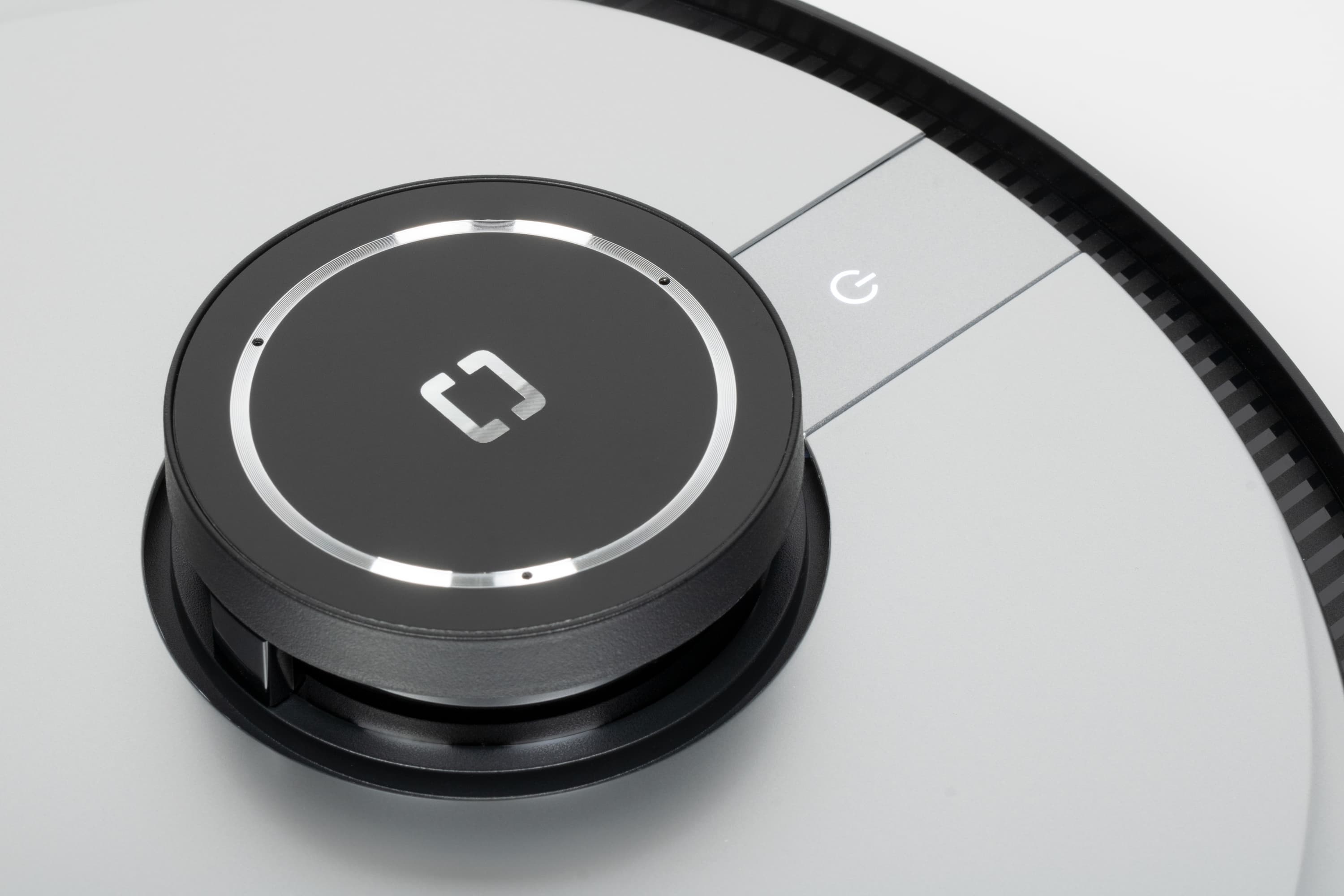 Над гладкой верхней панелью возвышается башенка лидара: в ней вращается основной навигационный орган пылесоса, состоящий из оптического излучателя и приемника. С помощью LDS-сенсора пылесос с высокой точностью определяет расстояние до препятствий и моментально строит карту помещения, планируя уборку. Рядом с лидаром расположена кнопка запуска автоматического режима со светодиодной подсветкой.