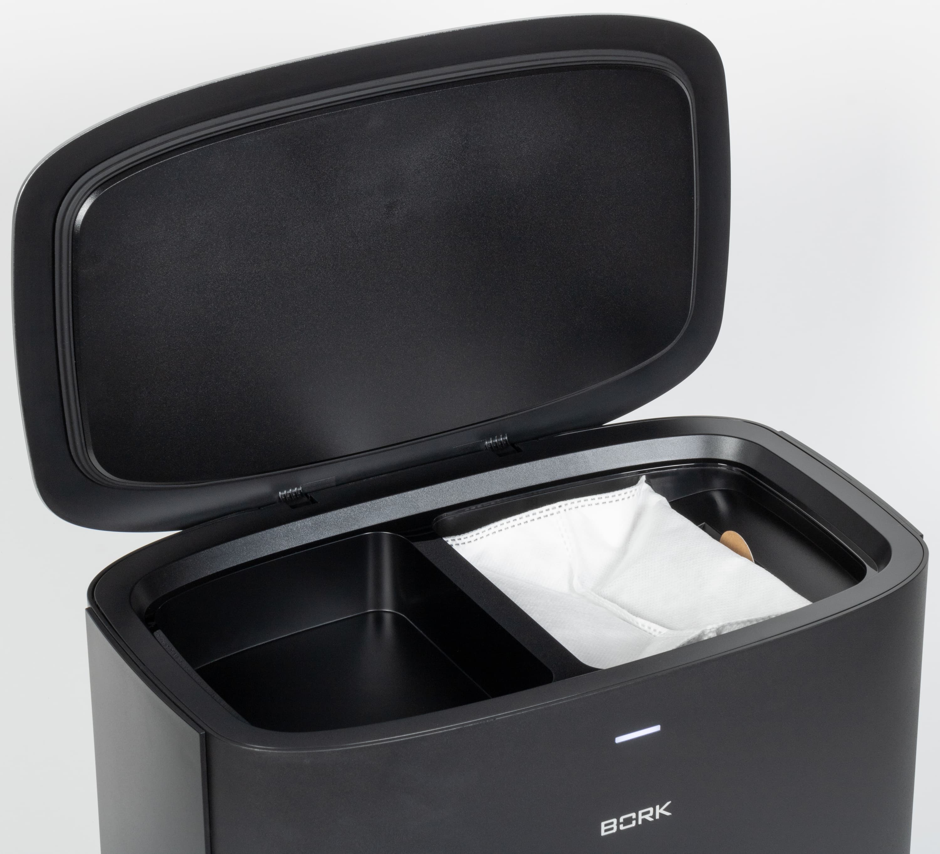 Пакет объемом 3 литра снабжен картонной задвижкой, позволяющей плотно закрыть его при извлечении из контейнера: это поможет не просыпать мусор по дороге к ведру. Эта же задвижка, кстати, дает базе сигнал о том, что мешок установлен правильно.