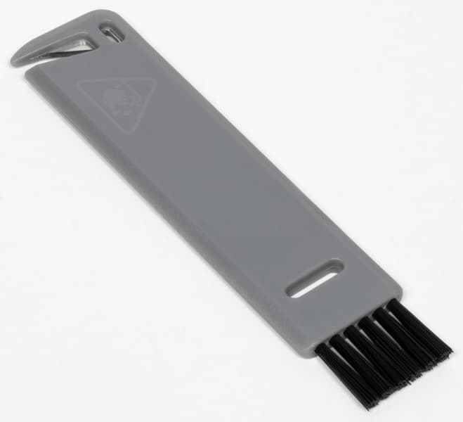 В комплект пылесоса входит несложное приспособление, состоящее из щетки для очистки труднодоступных уголков мусоросборника и лезвия для срезания намотавшихся на ротор ниток и волос.
