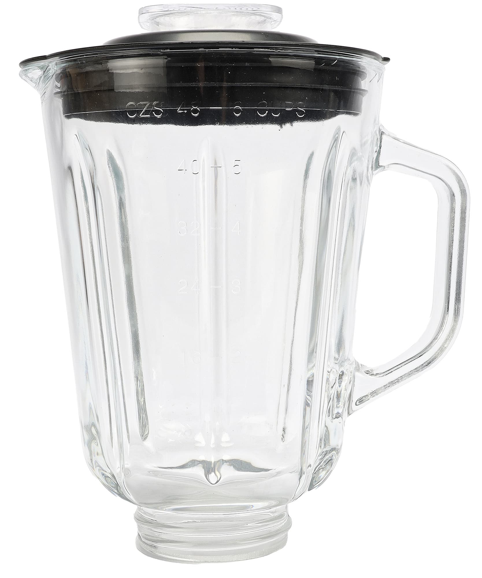 Стеклянный кувшин для измельчения продуктов имеет классическую форму. Максимальный полезный объем — 1500 мл. Это обозначено и на шкале объема, нанесенной на стенку кувшина.